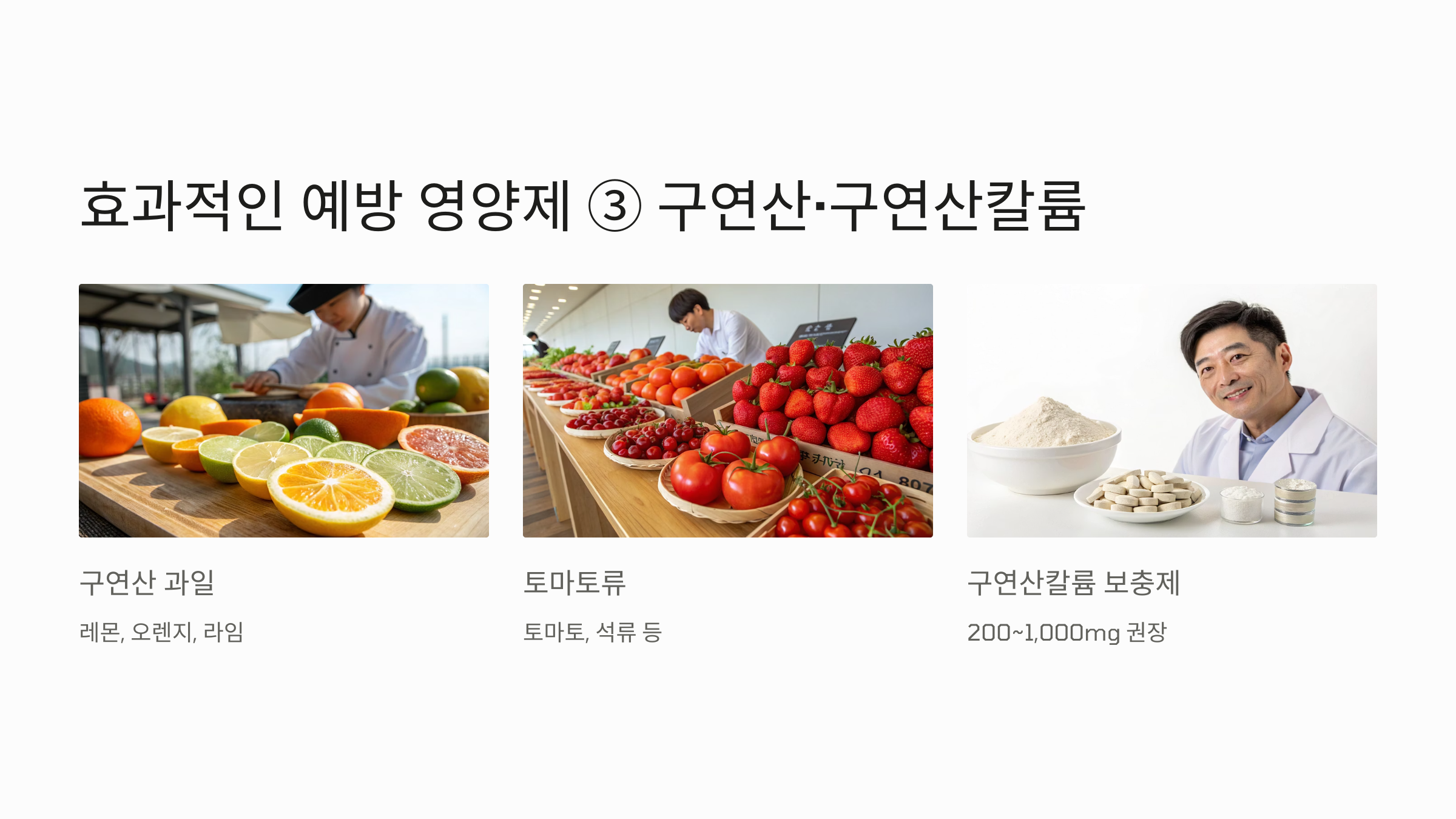 - 구연산: 소변 내 구연산 농도를 높여 결석 생성을 방지합니다.