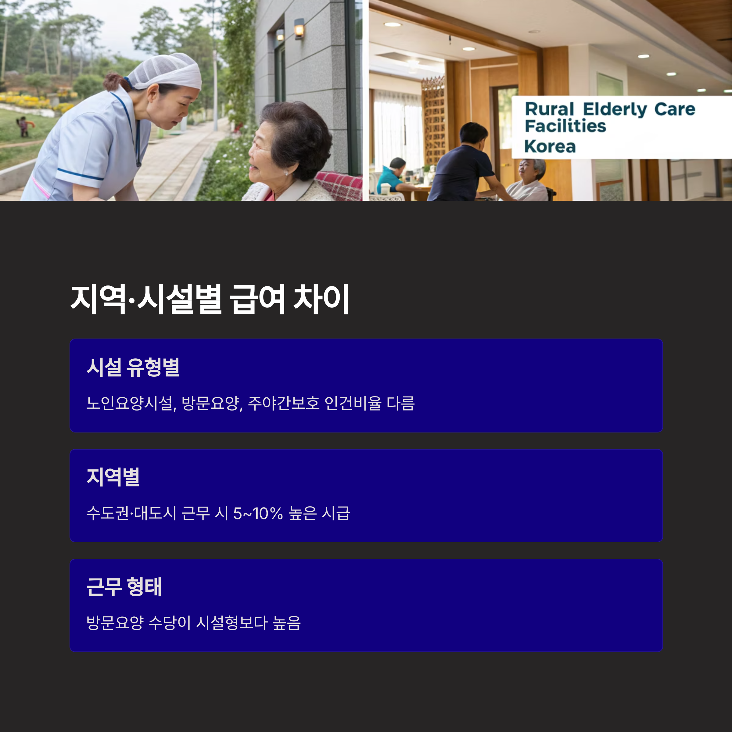 | 기관 차이 | 방문요양, 시설 요양 등 | 형태별 차등 |