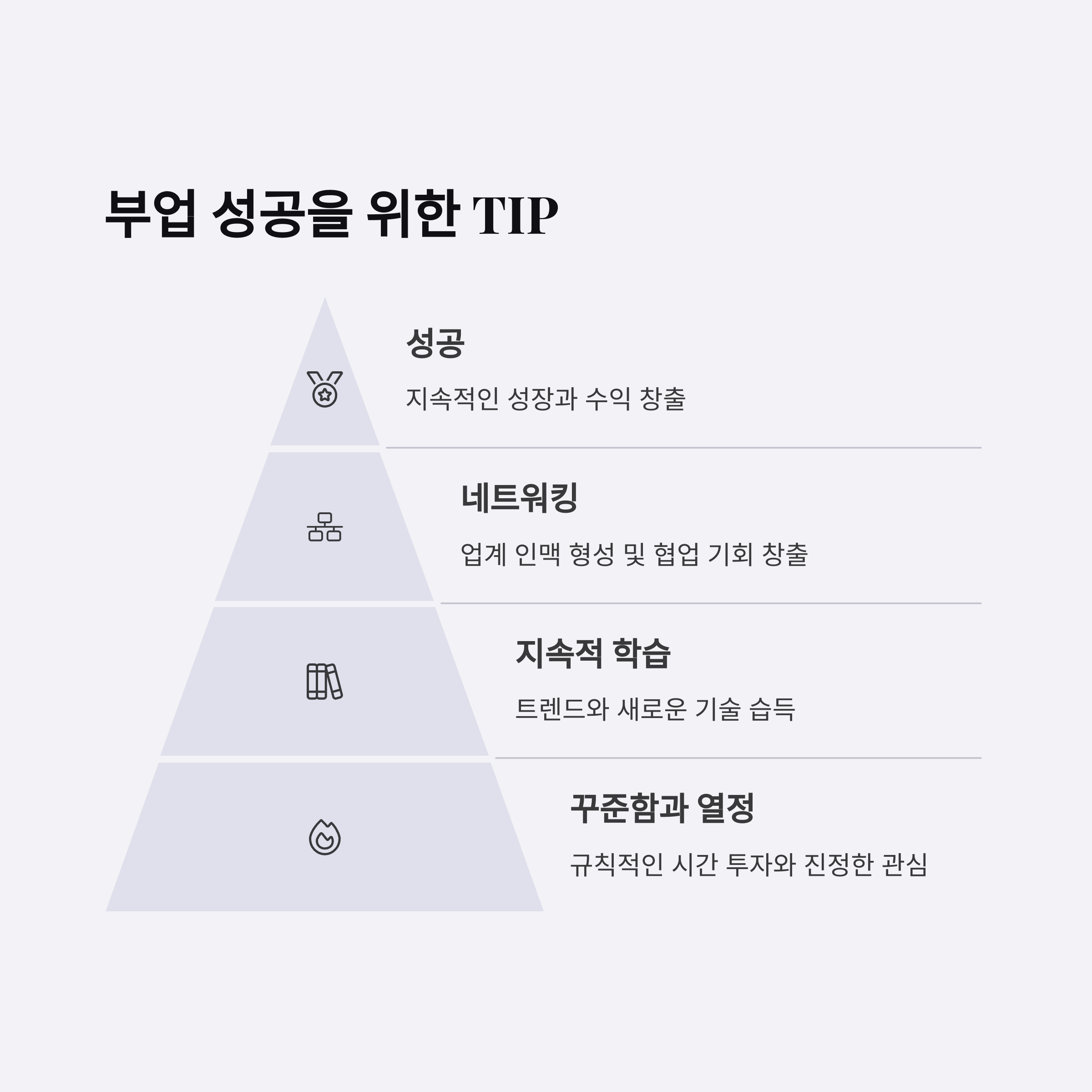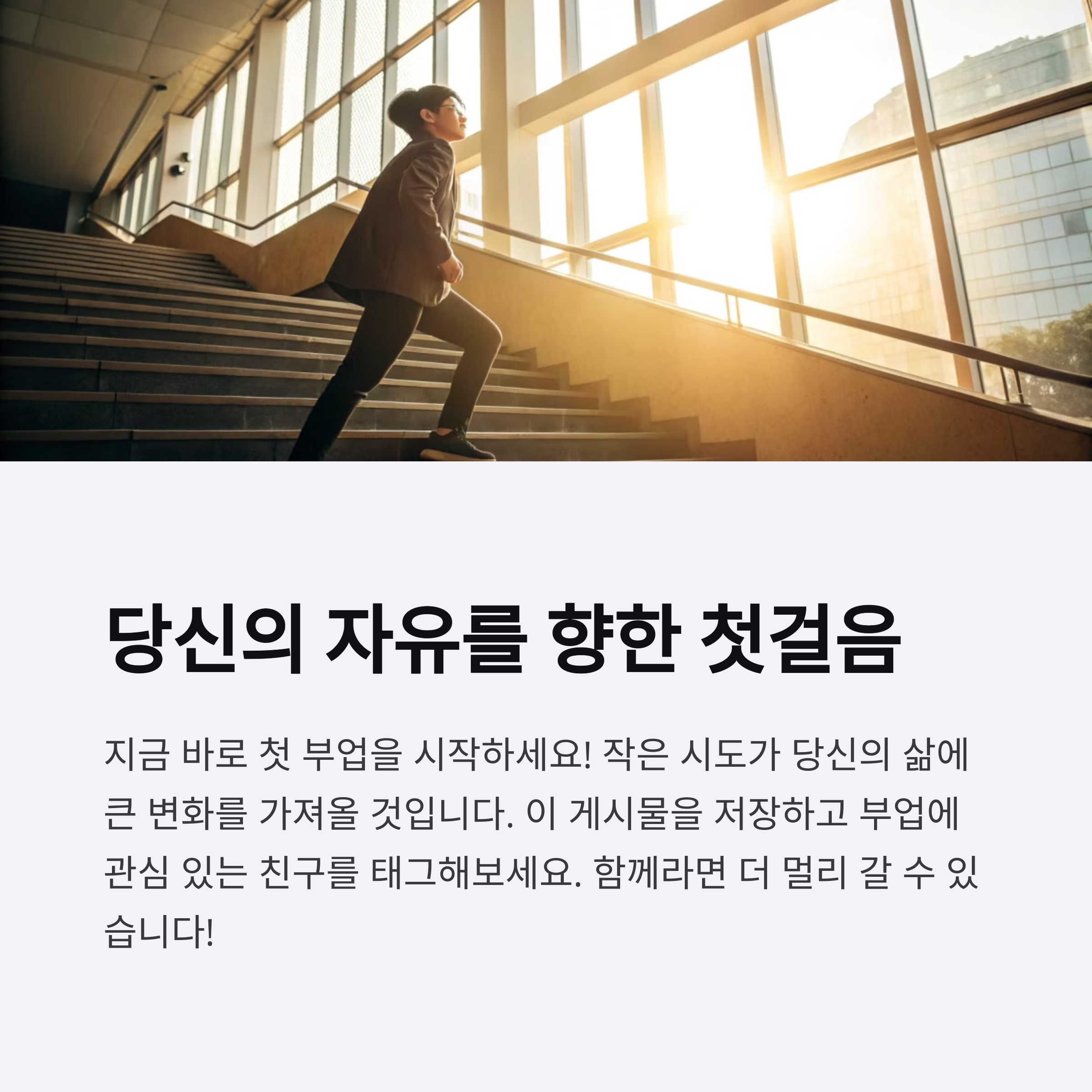 무엇보다 중요한 건 자유입니다. 부업을 통해 자신의 스케줄을 조정하고 원하는 분야에서 경험을 쌓으며 점점 더 자율적인 삶을 꾸릴 수 있습니다. 직장에서 주어지는 역할과 지시에만 따르기보다 나만의 브랜드와 시스템을 구축하는 과정은 삶에 활기를 불어넣어 줍니다. 처음엔 작게 시작하더라도 꾸준한 시도와 실천을 통해 미래를 바꾸는 강력한 자산이 될 수 있습니다.