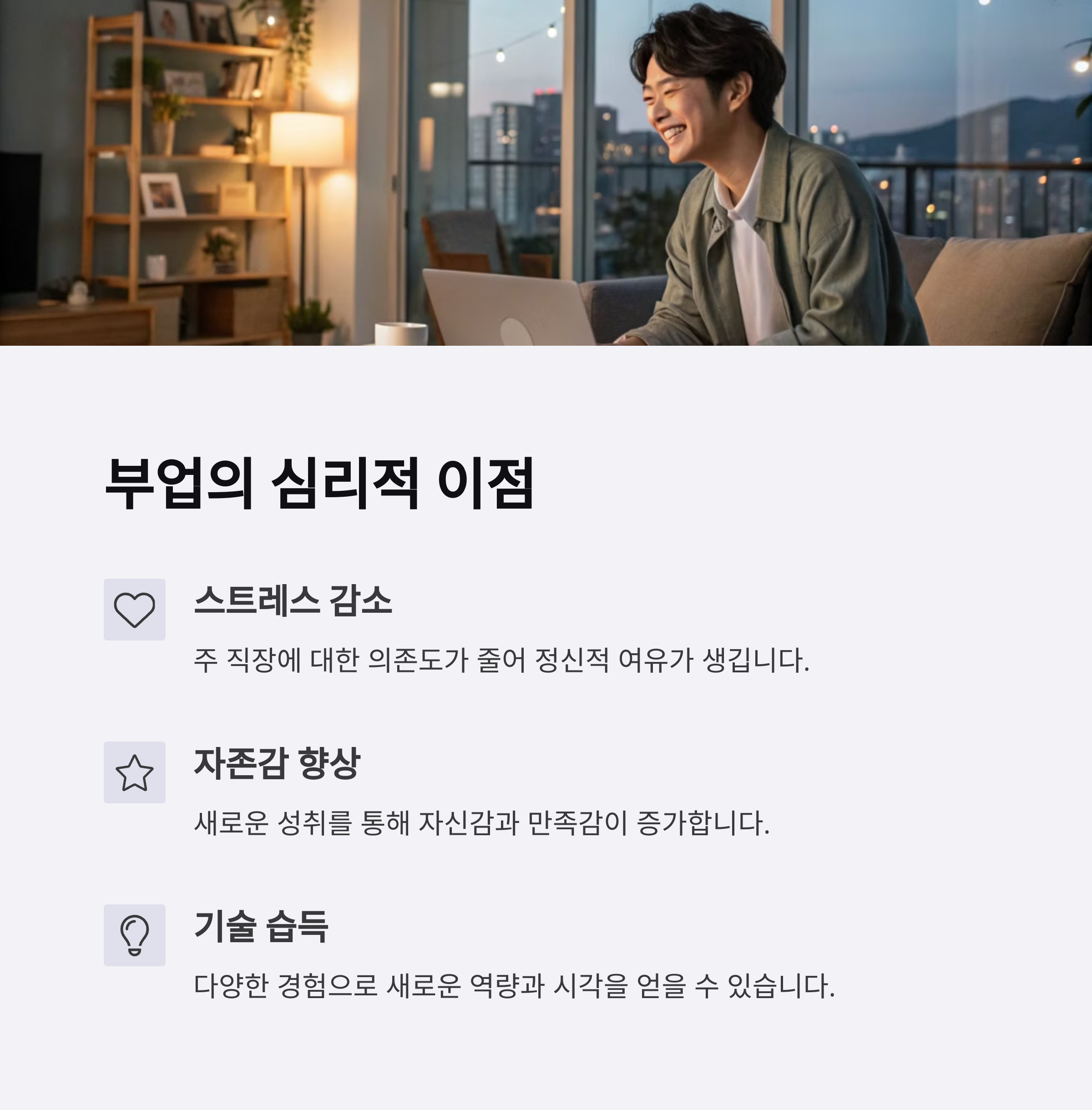 | 수입 다변화 | 본업 외의 소득원이 생겨 안정성이 높아집니다. |