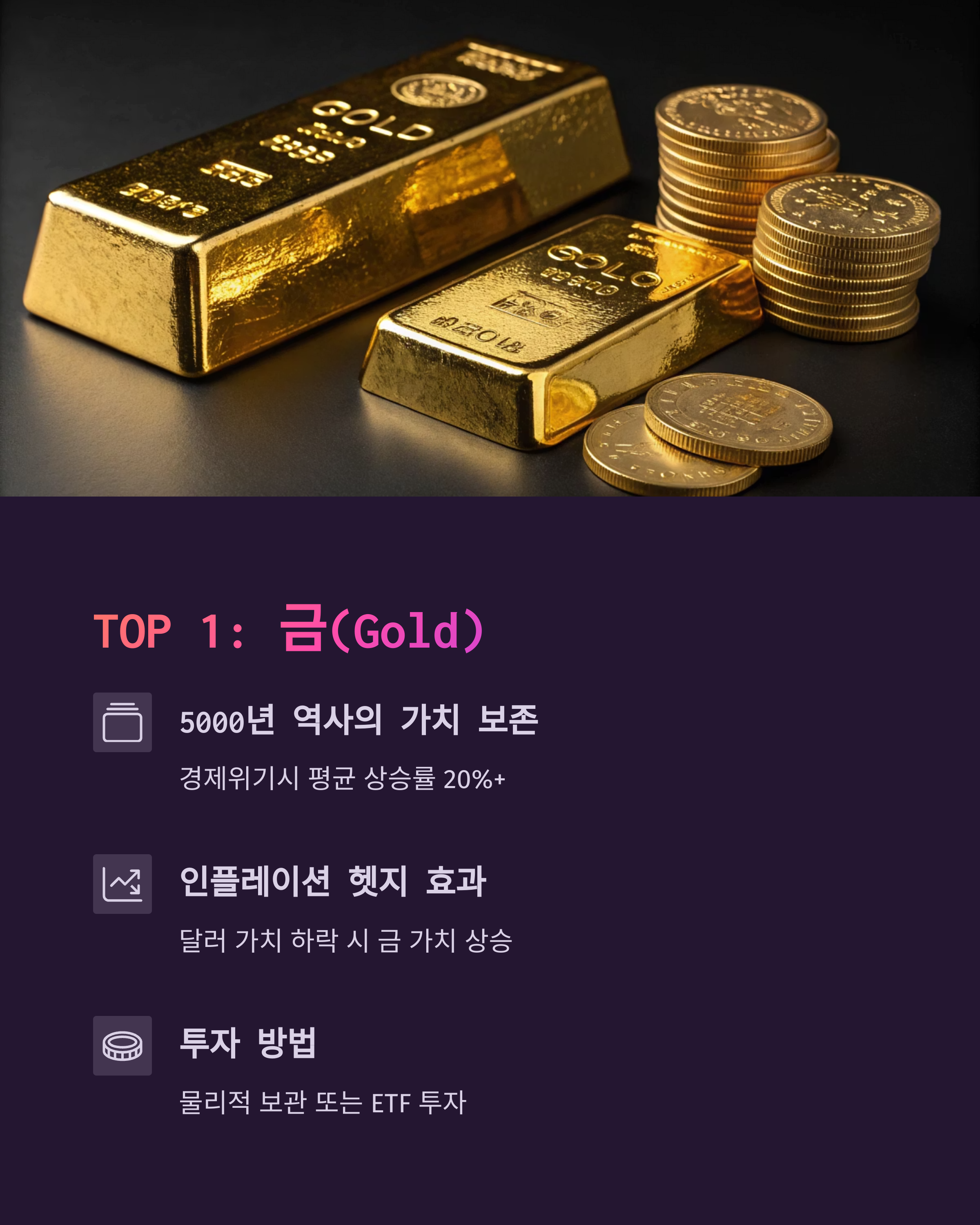 - TOP 1 : 금(Gold) – 실물 기반, 인플레이션 헷지
