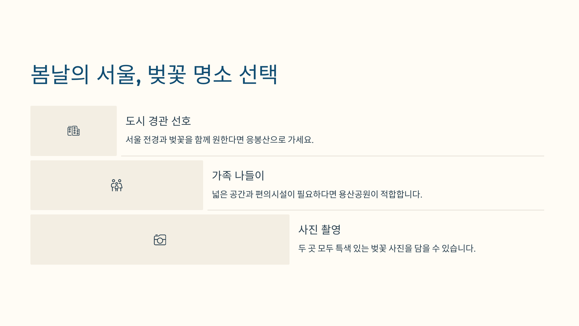 | 응봉산 특징 | 용산공원 특징 | 추천 대상 |