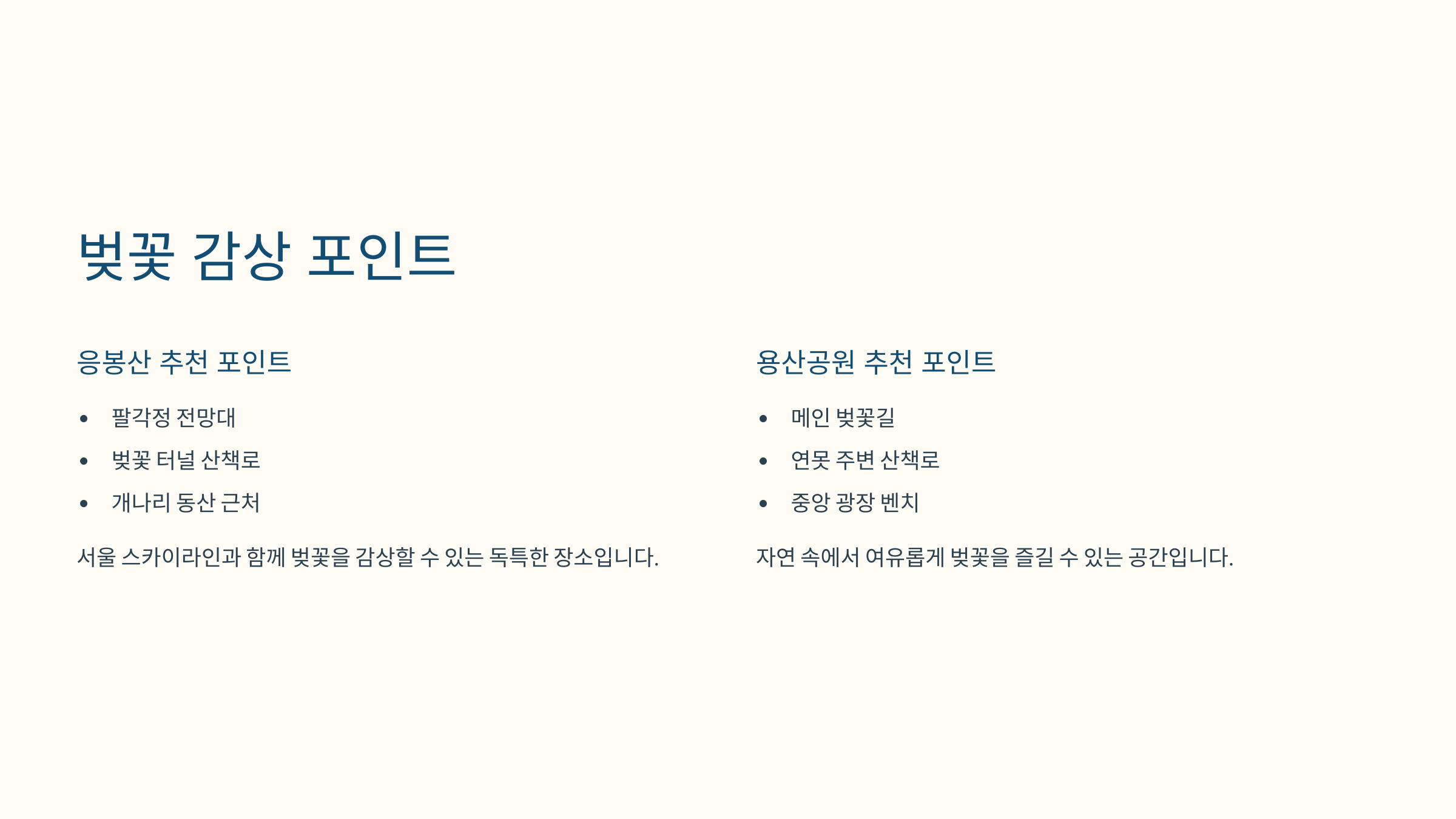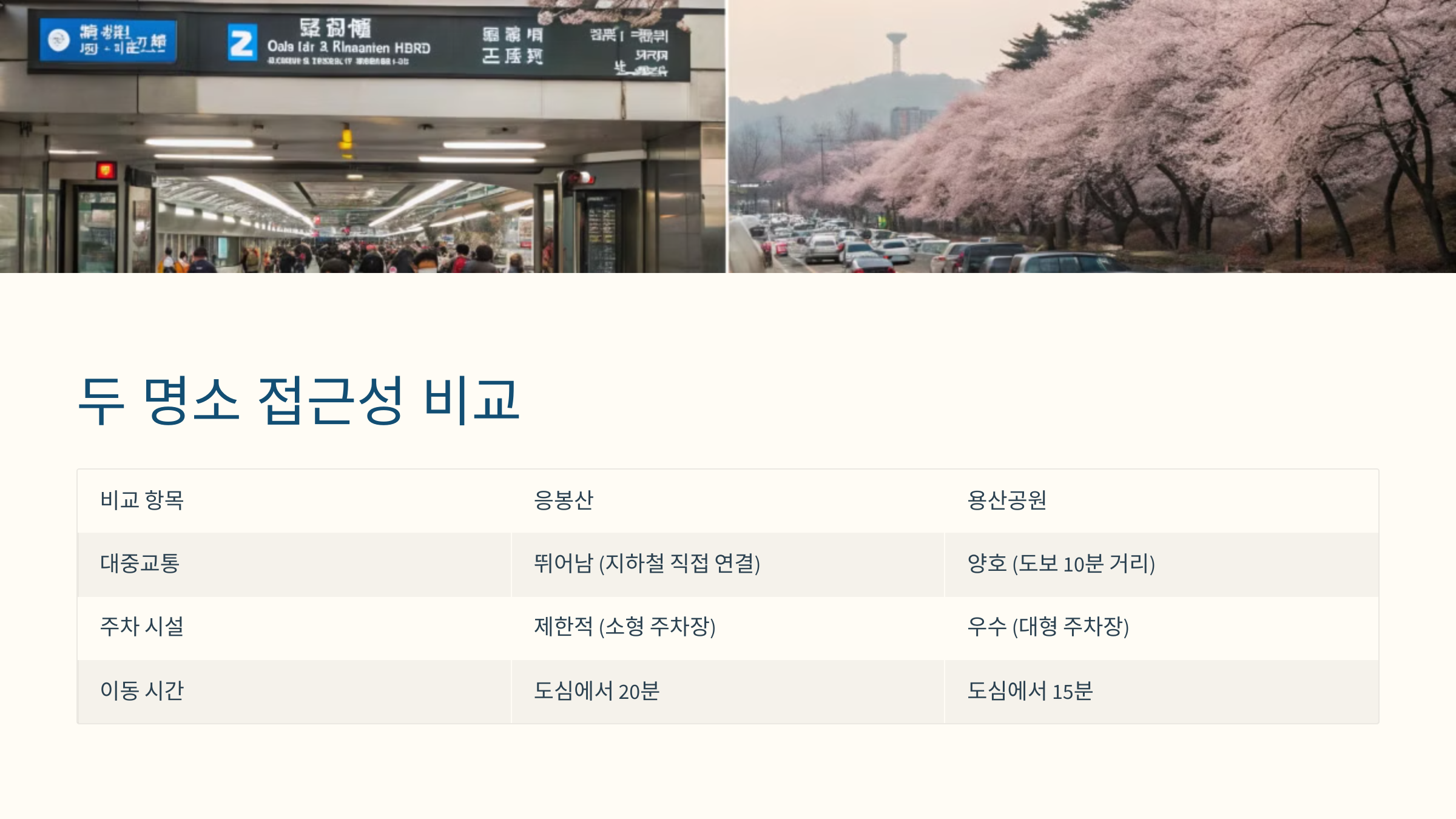 각기 다른 매력을 가진 두 명소 모두 벚꽃을 즐기기에 훌륭한 장소입니다. 활동적인 코스를 선호한다면 응봉산, 편안한 산책을 원한다면 용산공원이 더 잘 어울릴 수 있습니다. 선택에 앞서 날씨, 인파 예상, 주차 여부도 함께 고려하신다면 더욱 알찬 벚꽃 나들이가 될 것입니다.