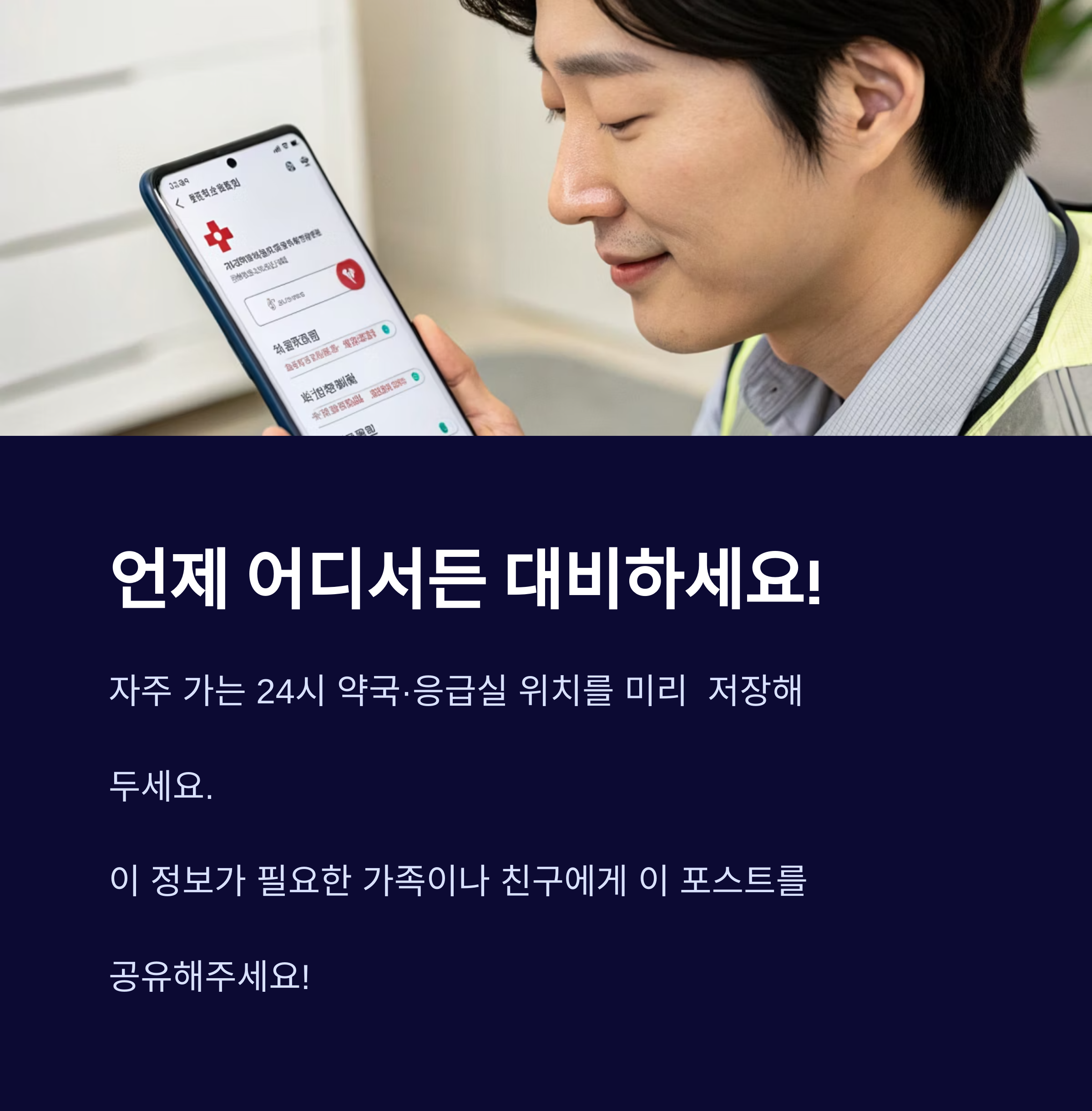 예기치 못한 위급 상황, 특히 밤, 공휴일, 명절처럼 의료기관이 대부분 닫은 시간엔 정보를 빠르게 찾는 것이 생명과 직결됩니다.