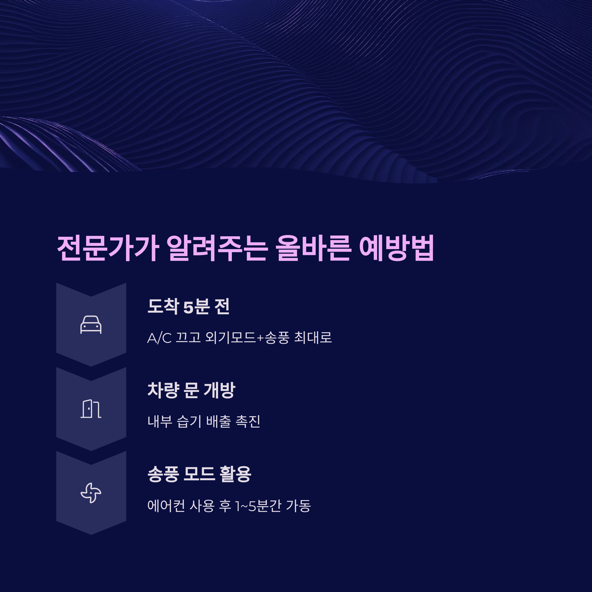 - 주차 시 유리창을 1~2cm 열어 두면 내부 온도와 습도가 낮아져 곰팡이 발생 억제에 도움