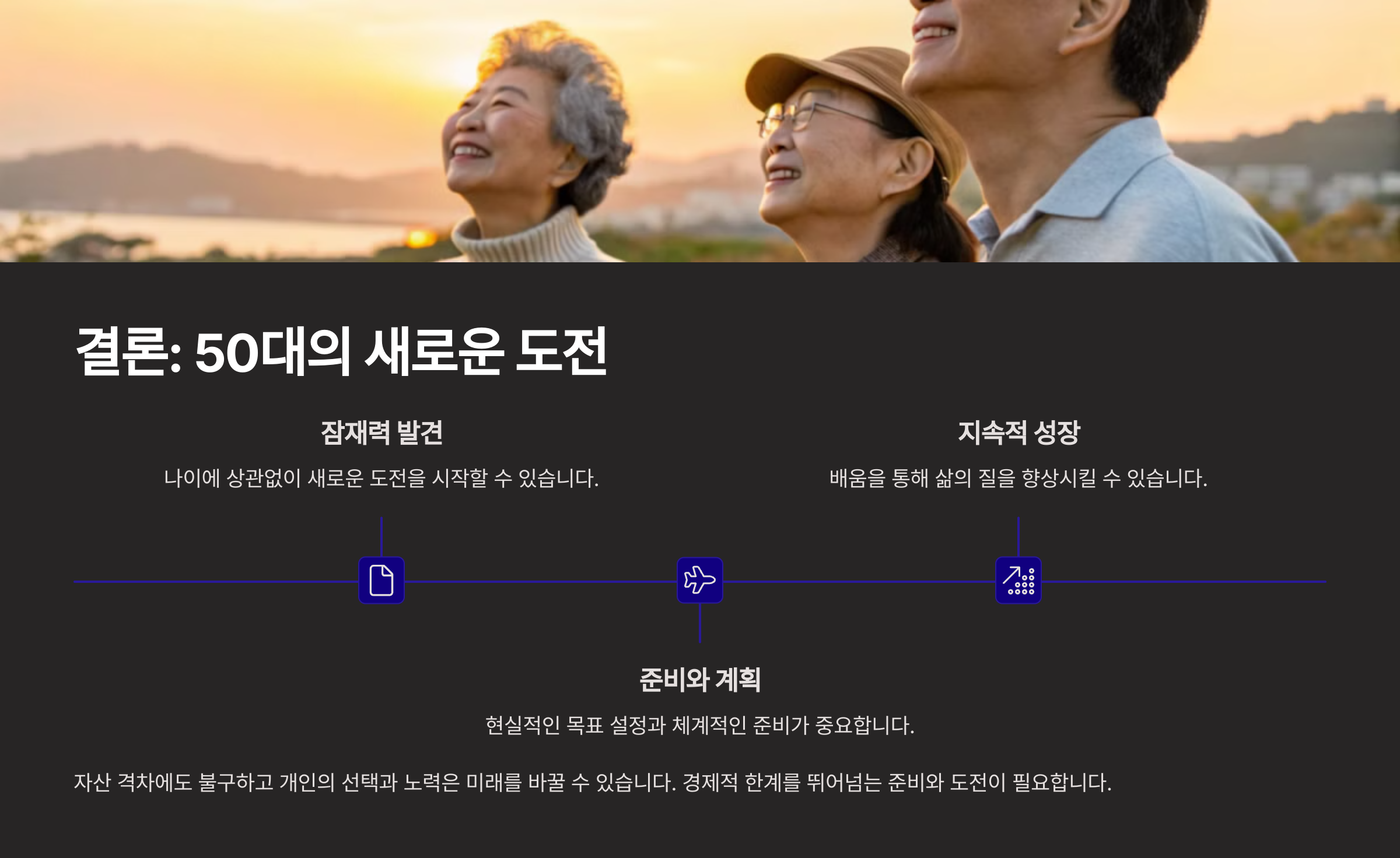 50대는 노후 준비의 골든타임입니다. 지금 자산이 많든 적든, 지금의 결정이 미래의 삶을 좌우하게 됩니다. 자산이 부족하더라도 포기하지 마세요. 지금부터 차근차근 준비하고 실행하면 얼마든지 새로운 삶의 길을 열 수 있습니다. 오늘의 고민은 내일의 기회로 만들 수 있습니다. 자신의 삶을 위한 첫 걸음을 지금 시작해보세요.