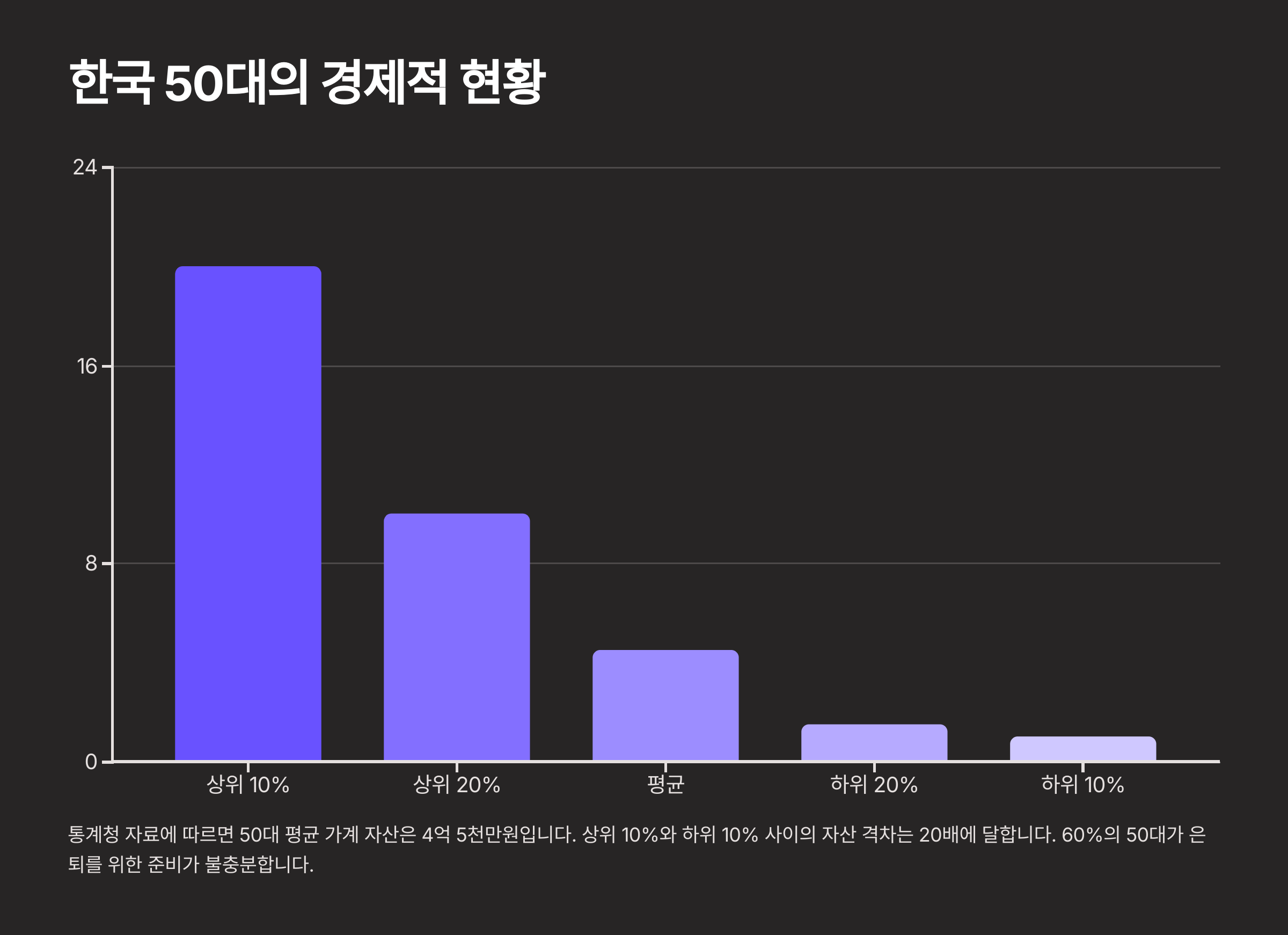 50대는 인생의 중반을 지나며 삶의 균형을 다시 정비해야 하는 시기입니다. 이 시기에 접어들면 많은 이들이 은퇴와 자녀 독립, 건강 관리 등을 고민하게 됩니다. 하지만 문제는 모두가 같은 출발선에 서 있지 않다는 점입니다. 자산 격차는 누군가에게는 선택의 자유를 주지만, 또 다른 누군가에게는 생존의 문제가 됩니다. 경제적 여유가 있는 사람은 다양한 취미 생활과 건강 관리를 시작하지만, 그렇지 않은 경우에는 은퇴조차도 감히 꿈꾸지 못하고 생계를 위한 제2의 직업을 찾아 나서야 합니다.