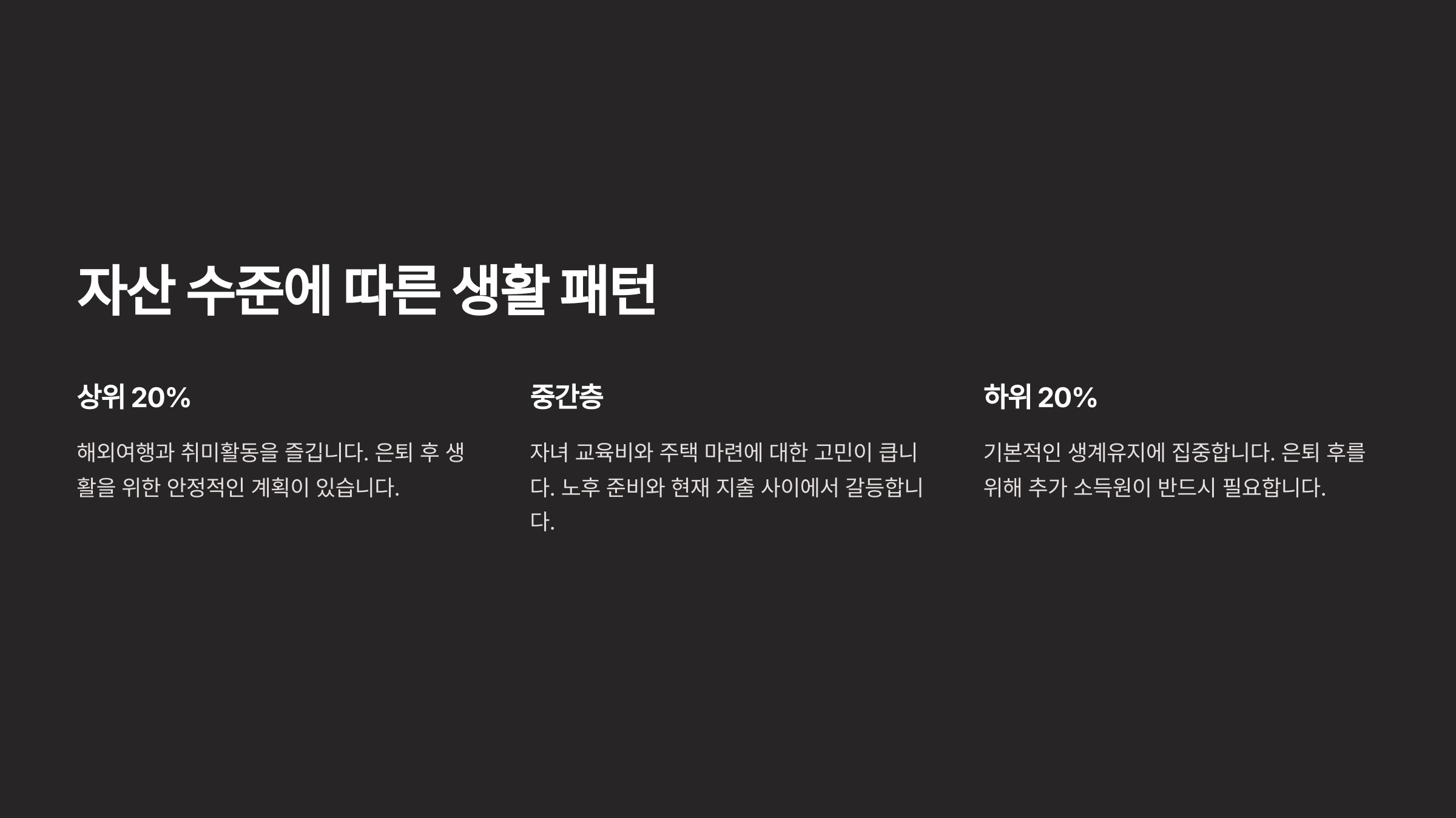 | 은퇴 준비 | 여유 있는 은퇴와 생계 불안의 차이가 존재합니다. |