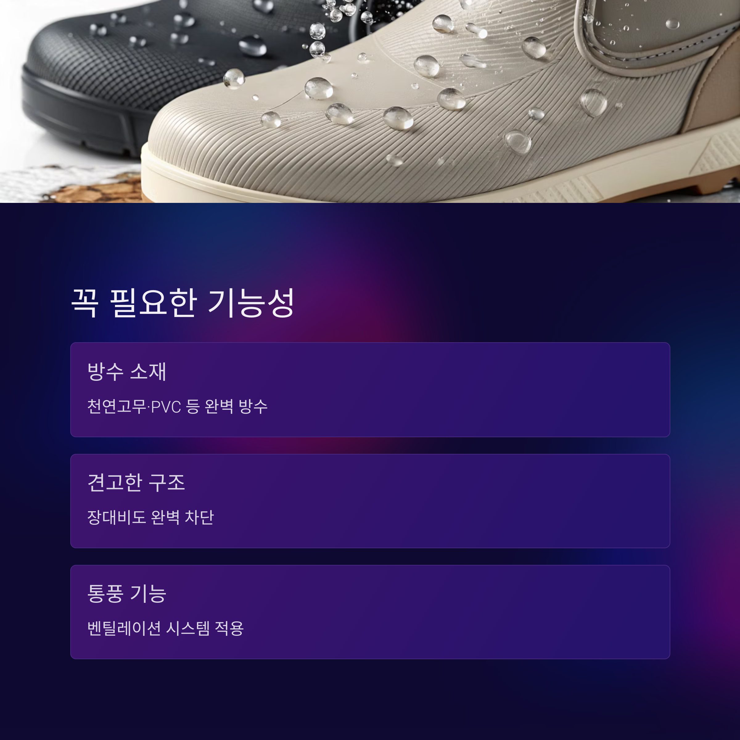 | 4~7만 원 | 방수+통기성+미끄럼방지 | 중간 | 직장인, 주부, 데일리용 추천 |