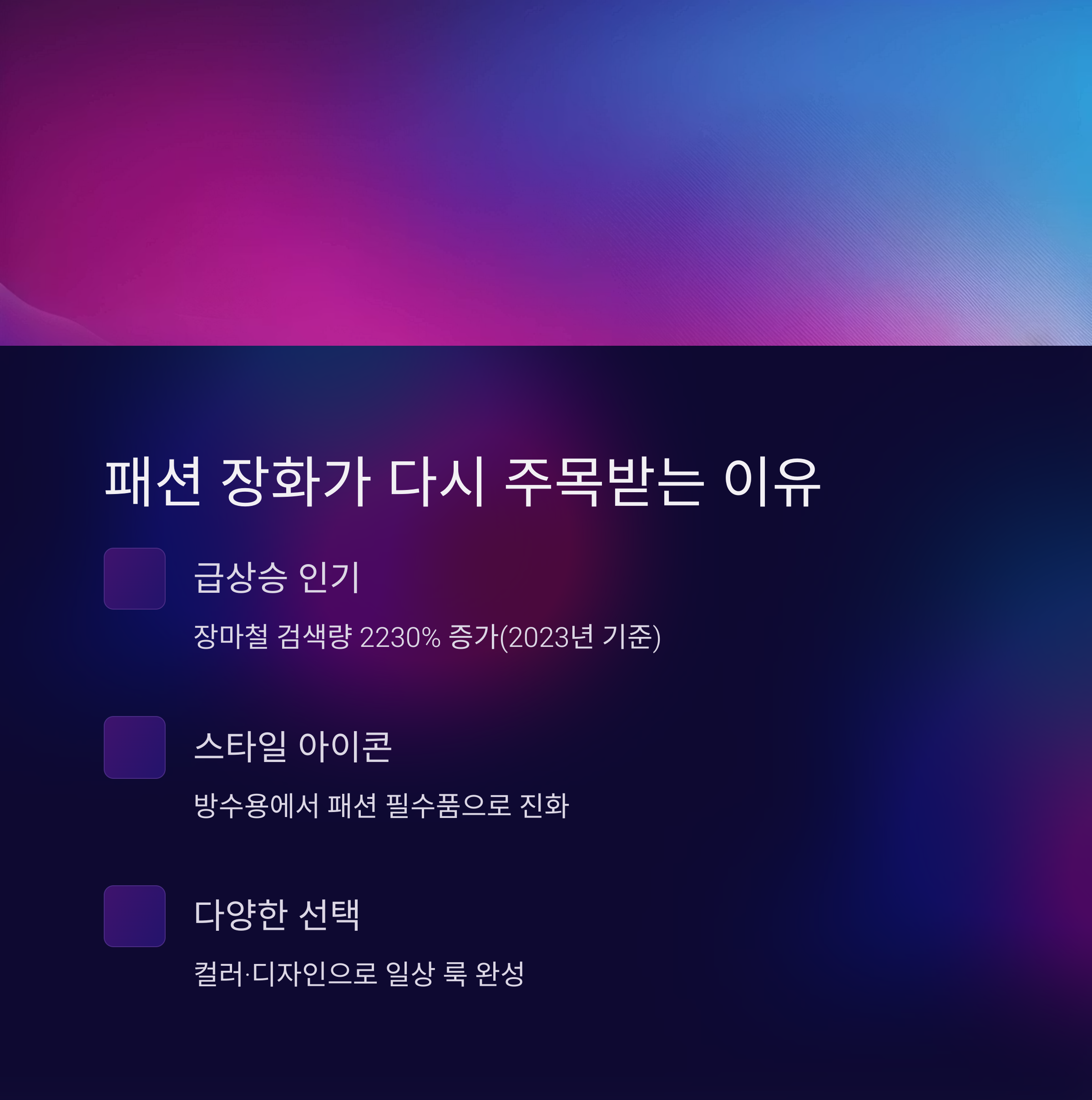 하지만 패션 장화는 실용성과 패션을 동시에 만족시키며 장마철 필수 아이템으로 자리 잡았습니다.