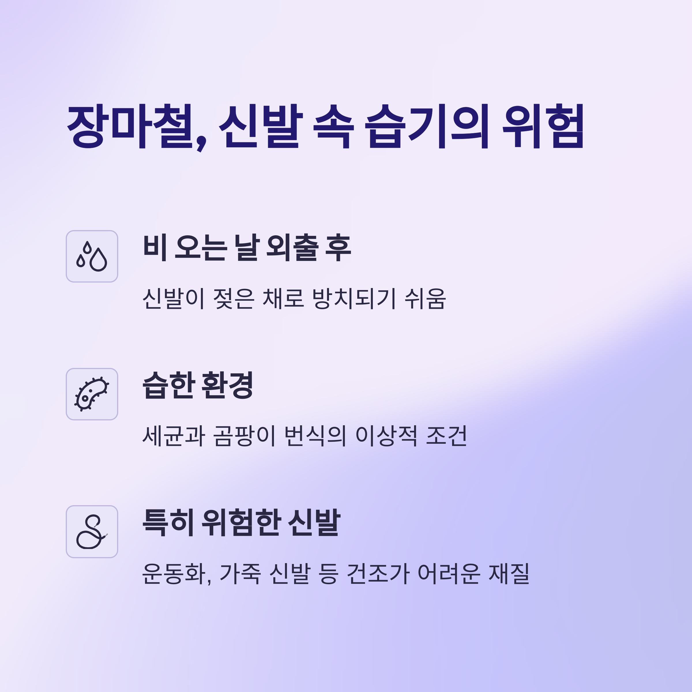 장마철 신발 속 습기는 단순 불쾌함이 아니라, 발 건강을 위협하는 원인이 될 수 있습니다.