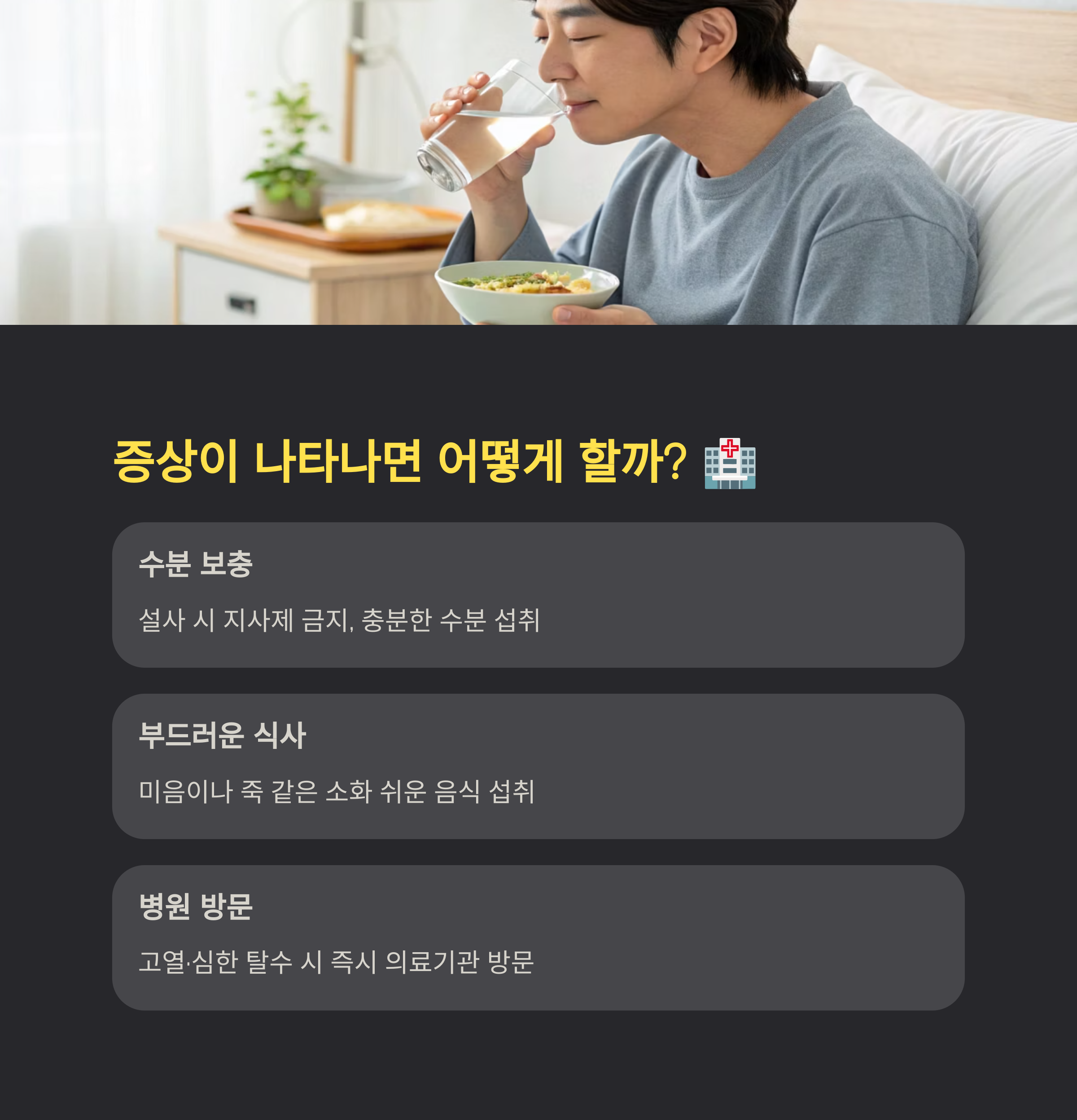 구토, 설사 시 수분 보충과 병원 방문이 중요해요.