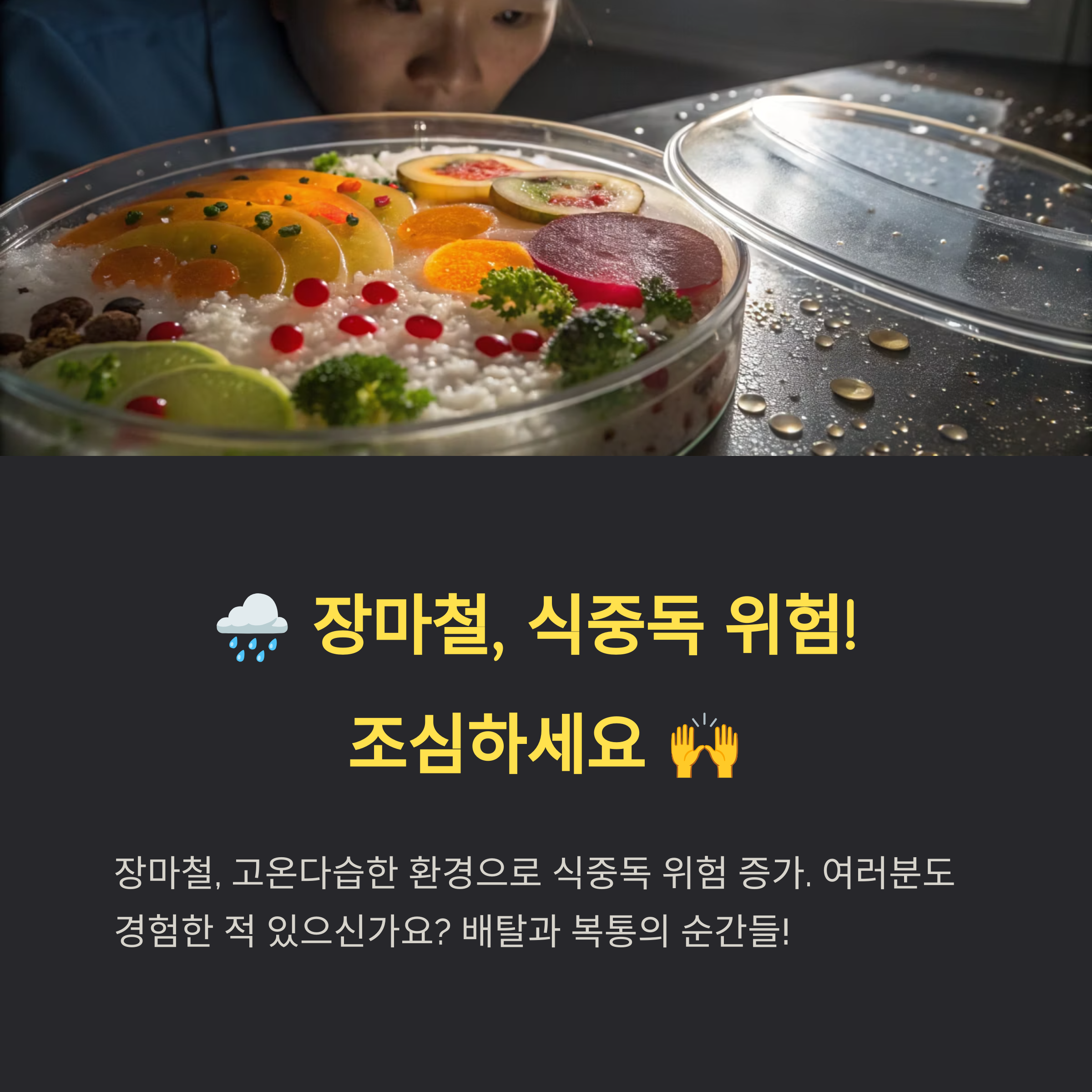 장마철에는 평소보다 한층 더 철저한 음식 보관과 위생 관리가 필요하다는 사실, 기억하세요.