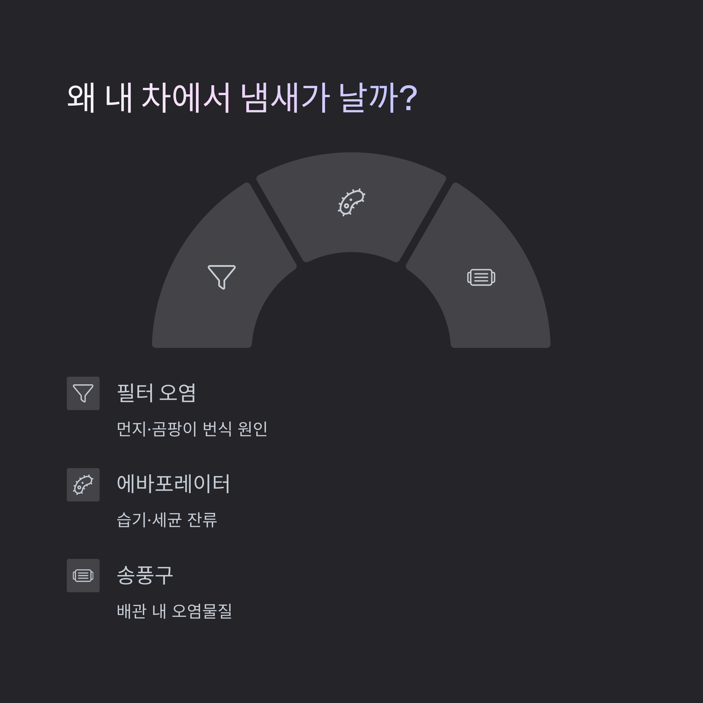 결국 냄새는 필터 + 증발기 + 습기라는 세 가지 원인이 복합적으로 작용한 결과입니다.