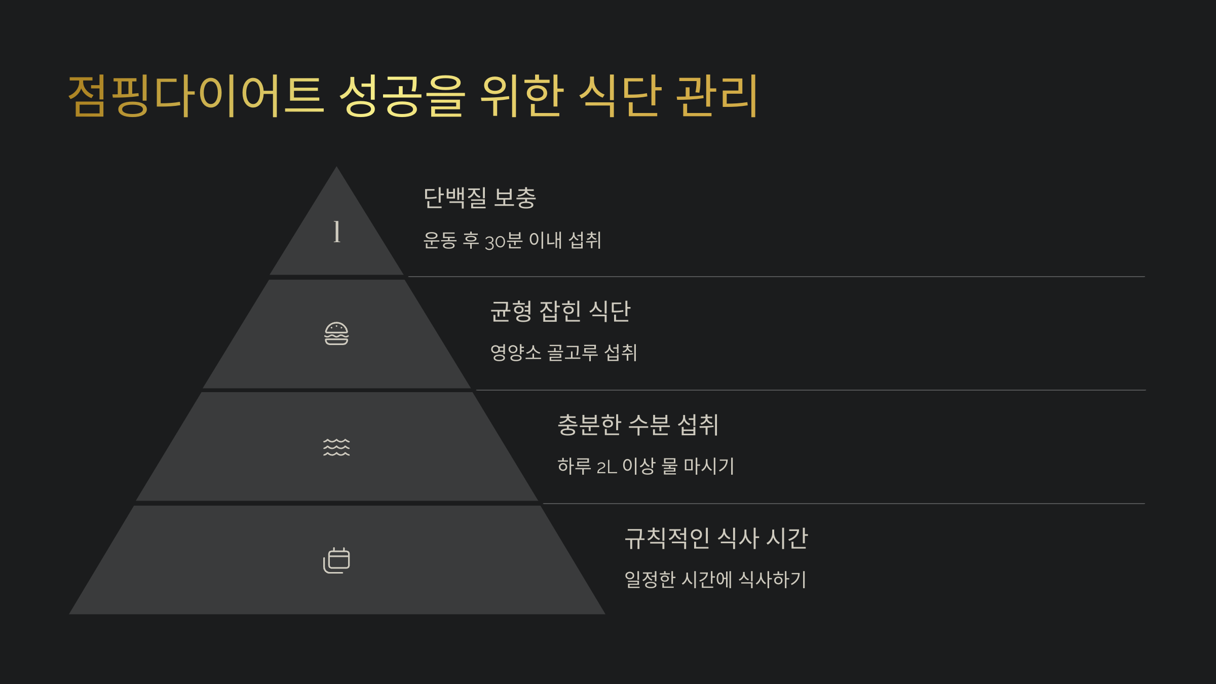 - 단백질/채소 중심 식단 + 수분 2L 이상 필수