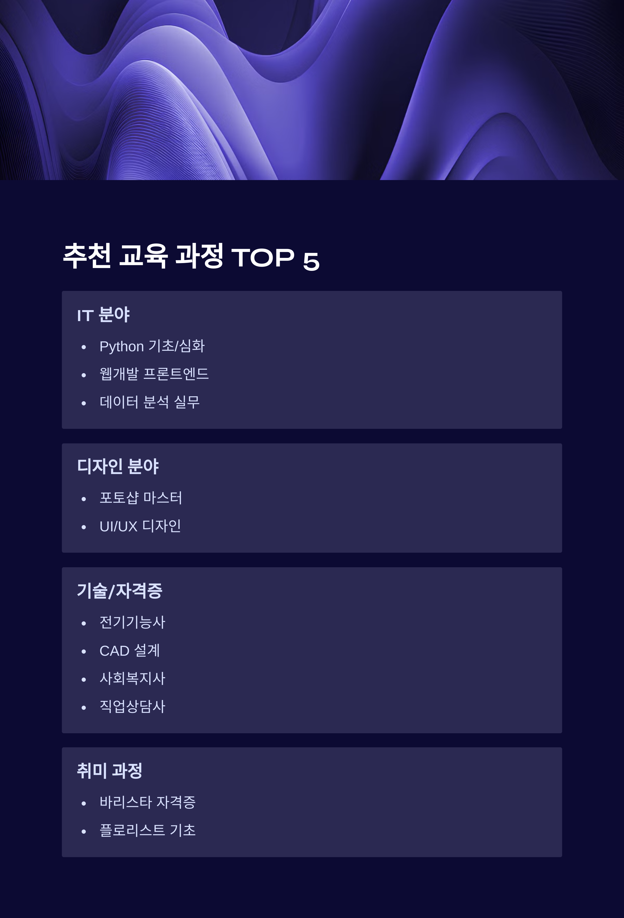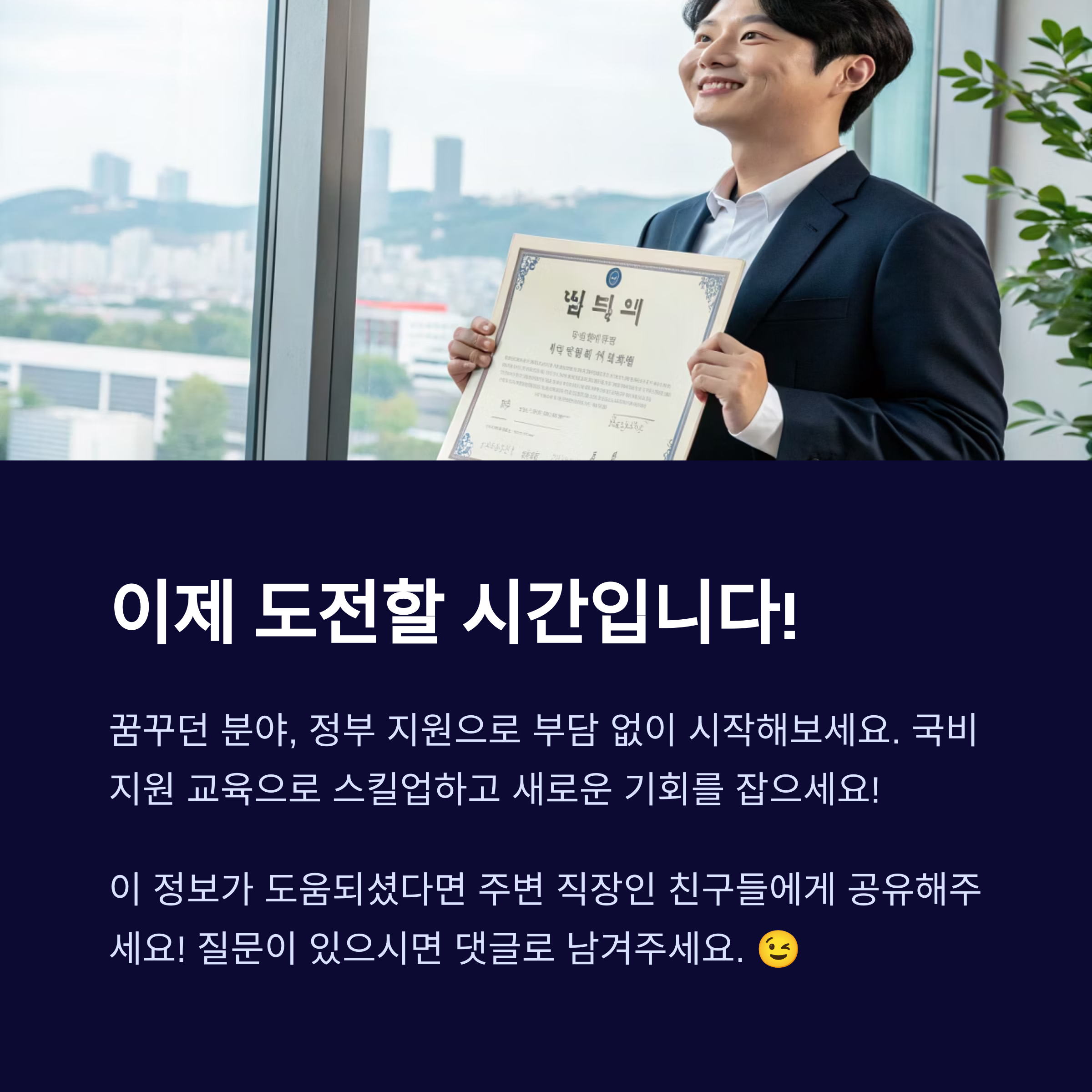 지금이 바로 자기개발의 타이밍입니다. 직장생활에 안주하지 않고 새로운 가능성을 향해 도전하려는 여러분을 응원합니다. 국비지원은 단지 교육을 받는 데에 그치지 않고, 새로운 경력의 출발점이 될 수 있습니다. 오늘의 작은 선택이 내일의 큰 변화를 만들어내니, 주저하지 말고 한 걸음 내딛어 보세요. 실속 있고 효과적인 커리어 관리를 원한다면 국비지원 제도를 꼭 활용해 보시길 바랍니다.