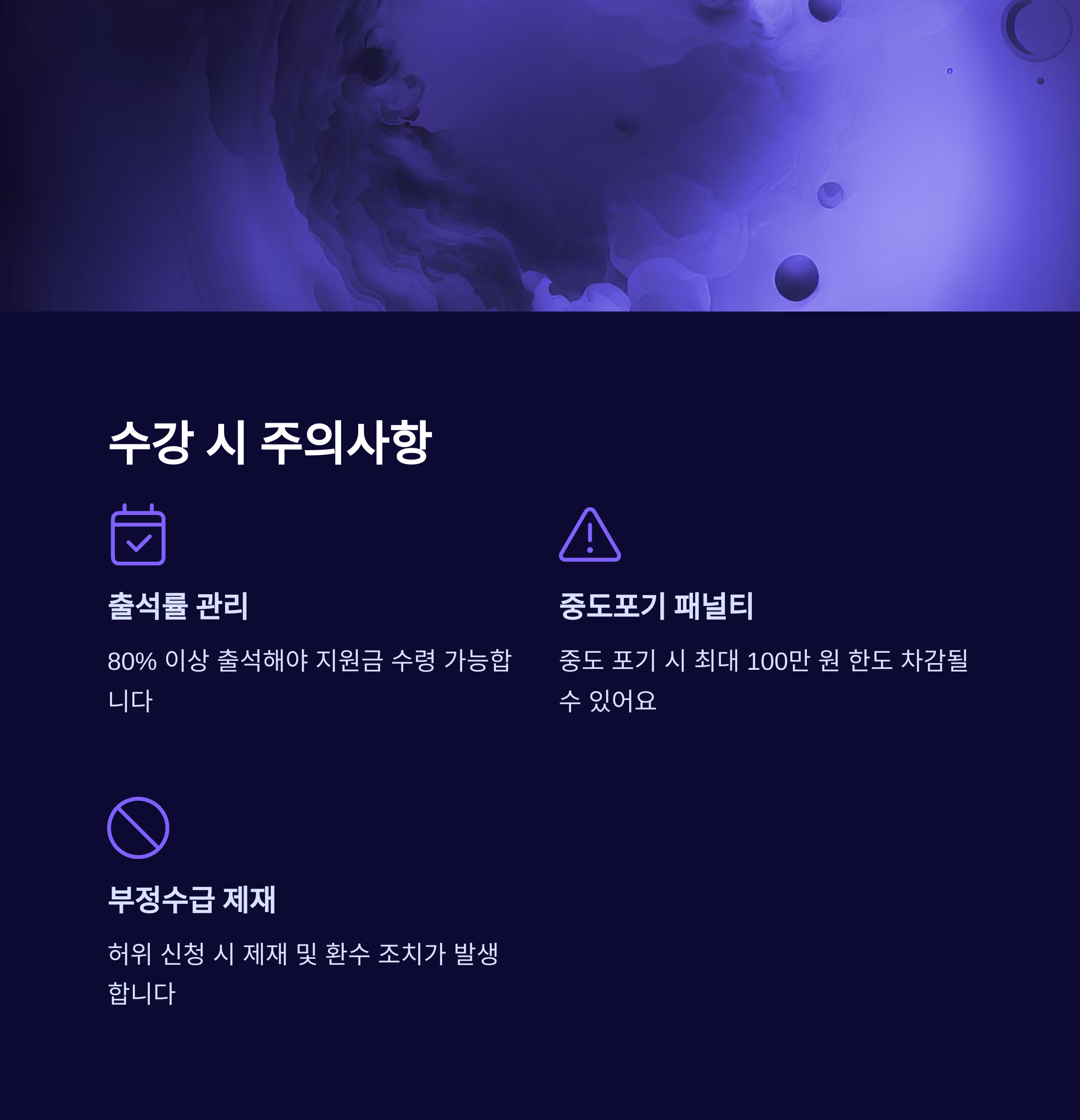 교육 수강을 완료하면 수료증을 발급받을 수 있고, 일부 과정의 경우 자격증 시험 응시도 가능합니다. 이러한 자격증은 이직이나 승진, 또는 프리랜서 활동 시 큰 장점이 될 수 있습니다. 단, 중도 포기 시 패널티가 부여될 수 있으므로 반드시 본인의 일정과 학습 의지를 고려한 뒤 신청을 진행하는 것이 바람직합니다. 꾸준한 자기계발과 성장의 기회를 찾고 있다면 지금이 바로 적기입니다.