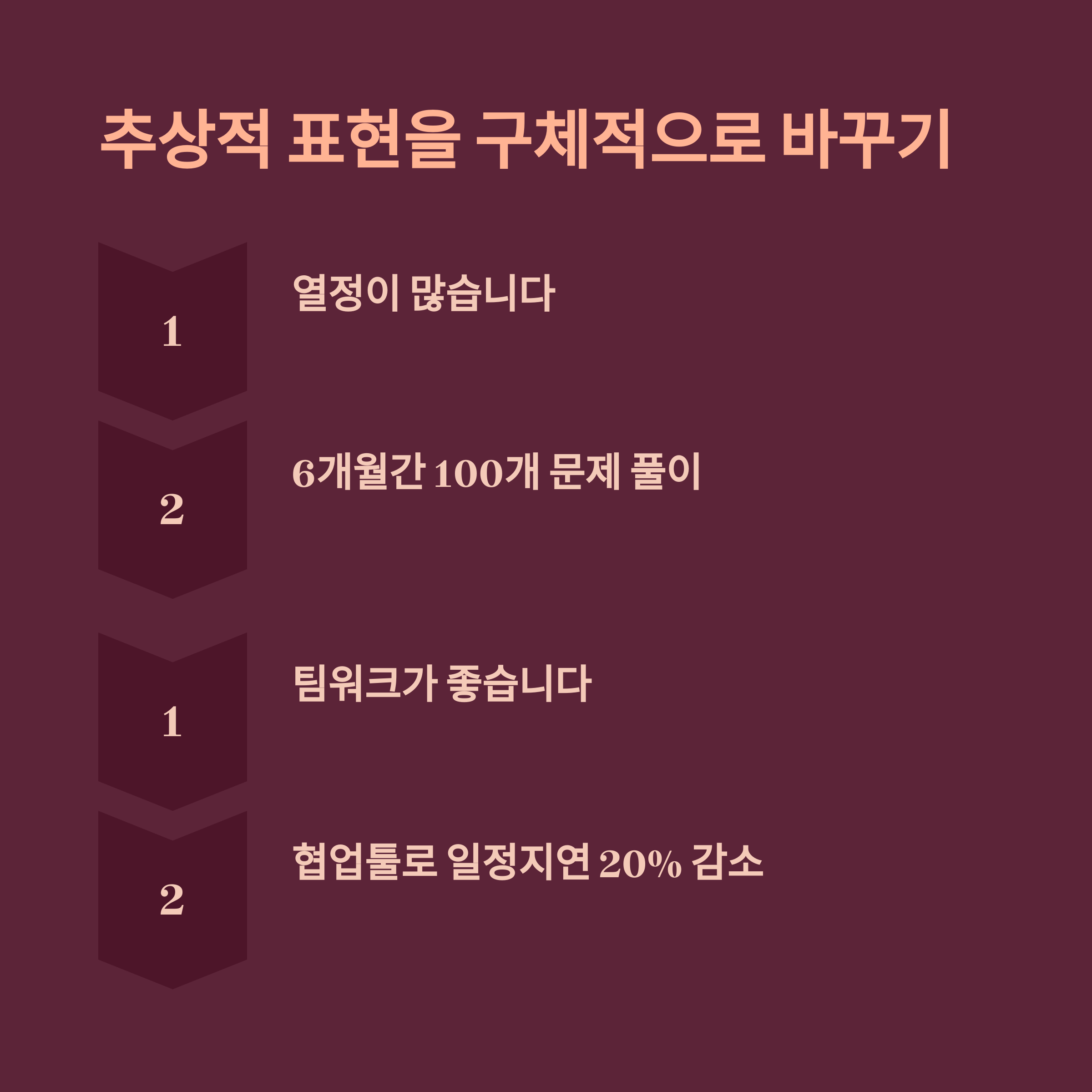 | 행동 → 결과 | "SNS 홍보로 기존 대비 방문자 수를 2배 늘릴 수 있었습니다." |