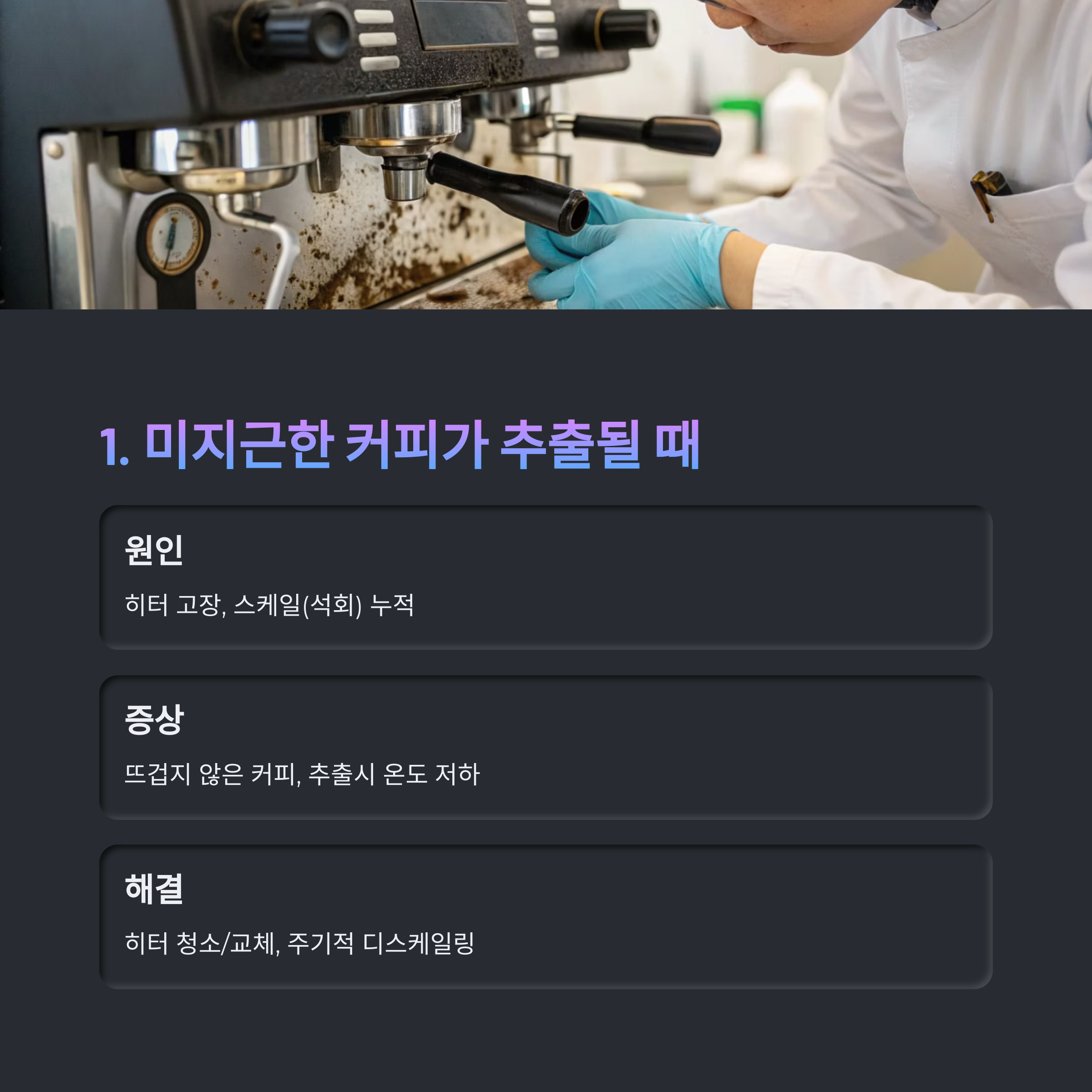 커피머신은 매일 사용하는 만큼, 고장 전조 증상도 작고 미묘하게 다가옵니다.