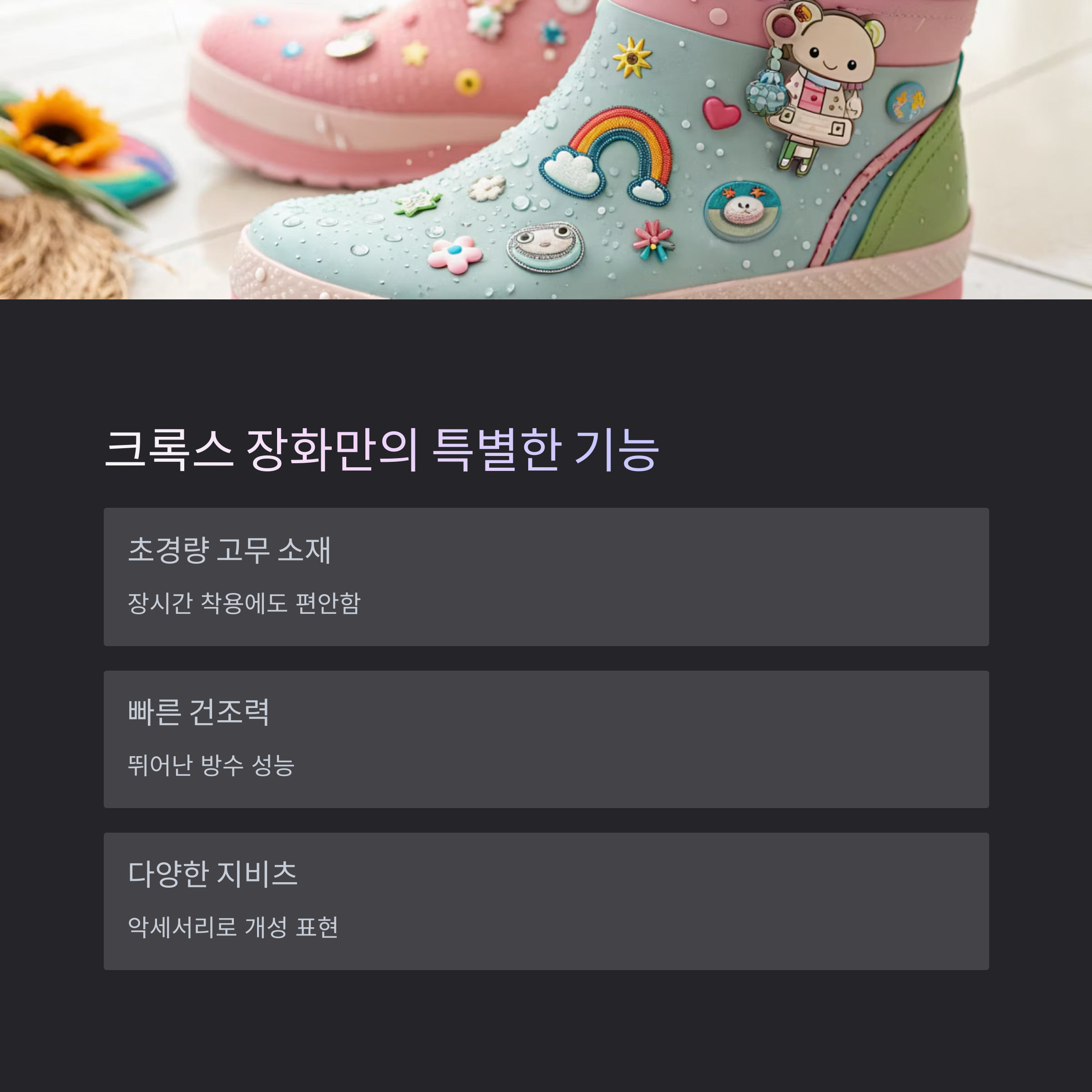 | 편안함 | 가벼운 무게, 크록스 특유의 착용감 | 장시간 착용에도 무리 없음 |