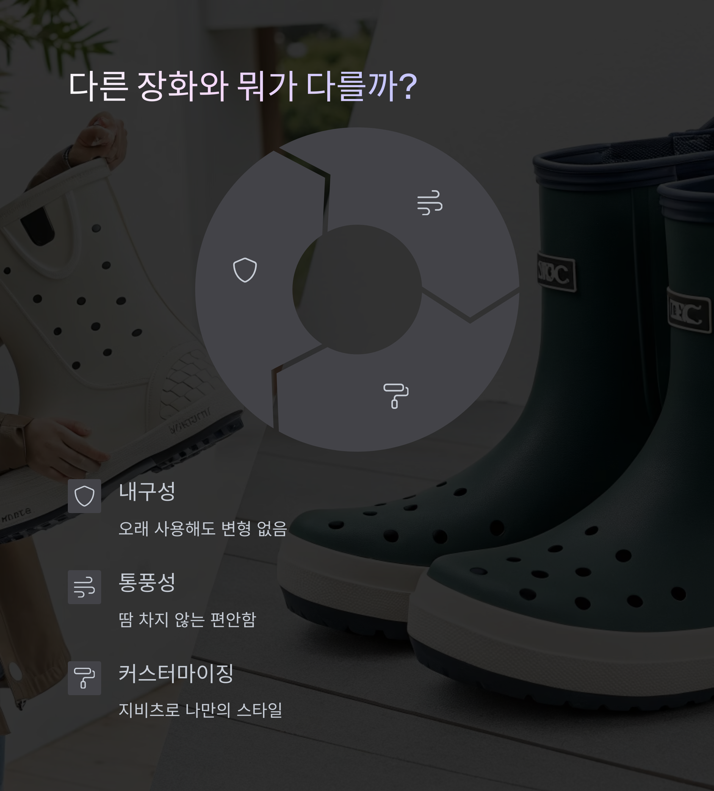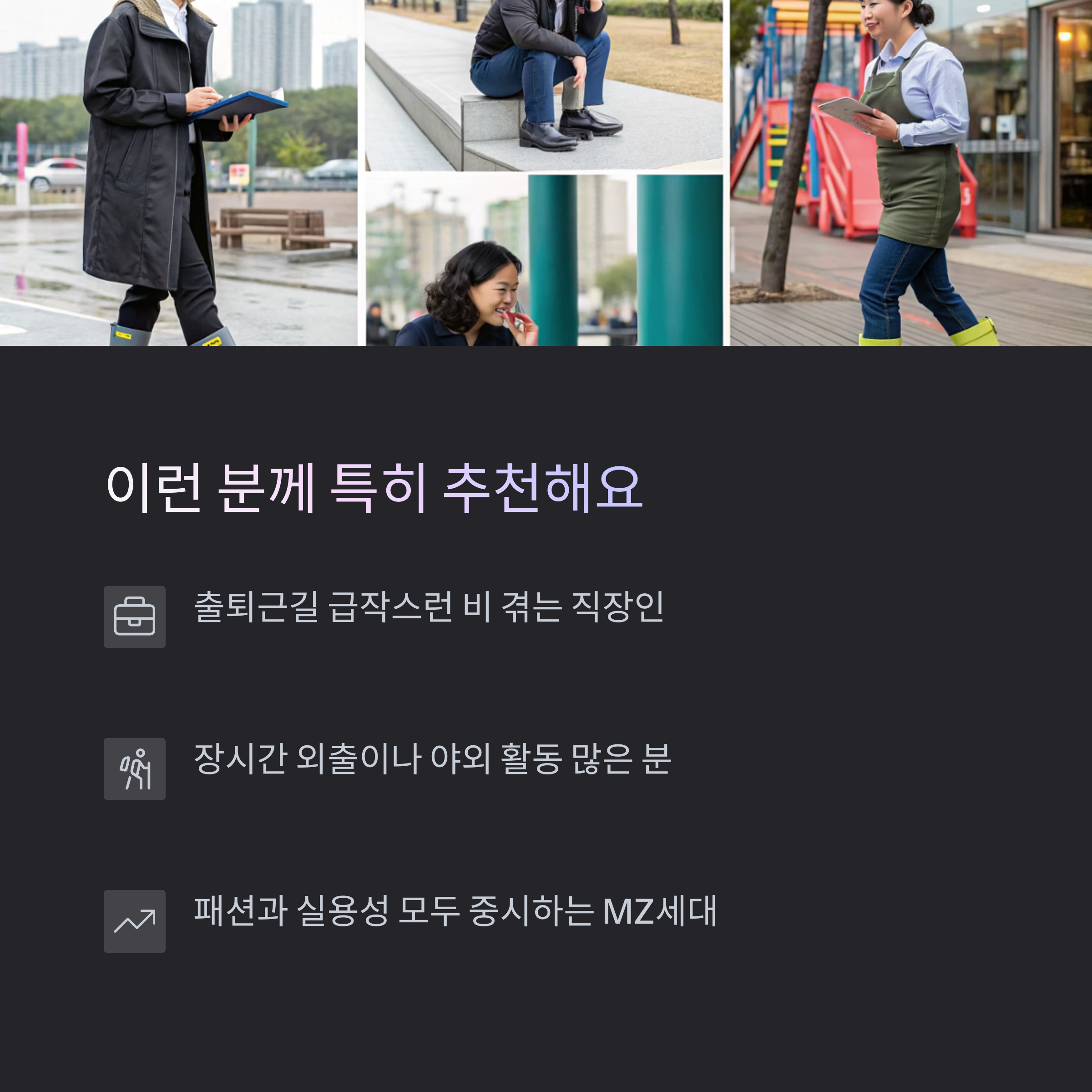 기존 장화의 투박함을 없애고, 가볍고 스타일리시한 디자인으로 젊은 층까지 사로잡은 것이 비결이에요.