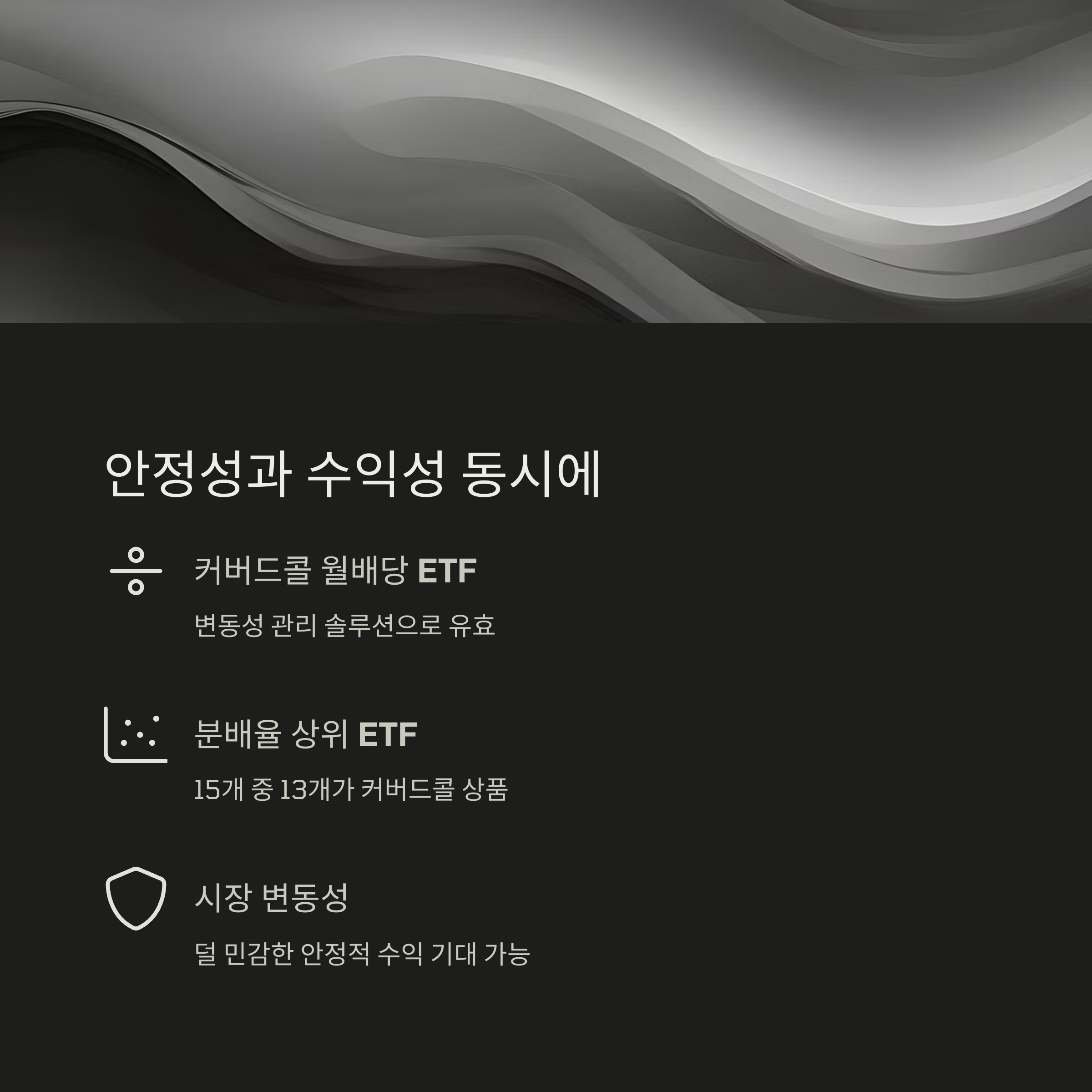 | 수익구조 | 꾸준한 배당 또는 안정적 지수 추종 |
