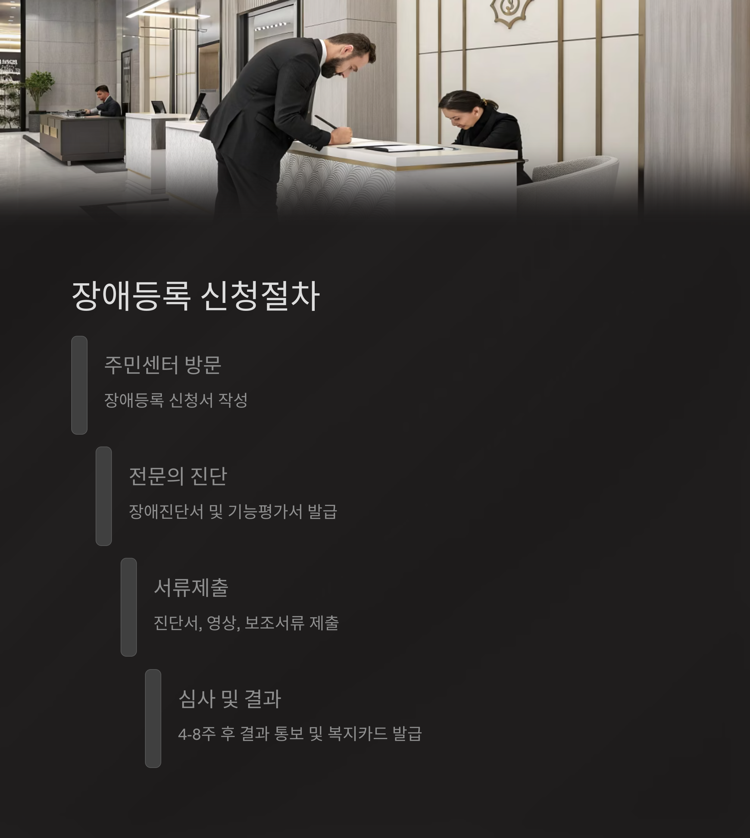 | 1단계 | 주소지 주민센터 방문 → 장애등록 신청 |