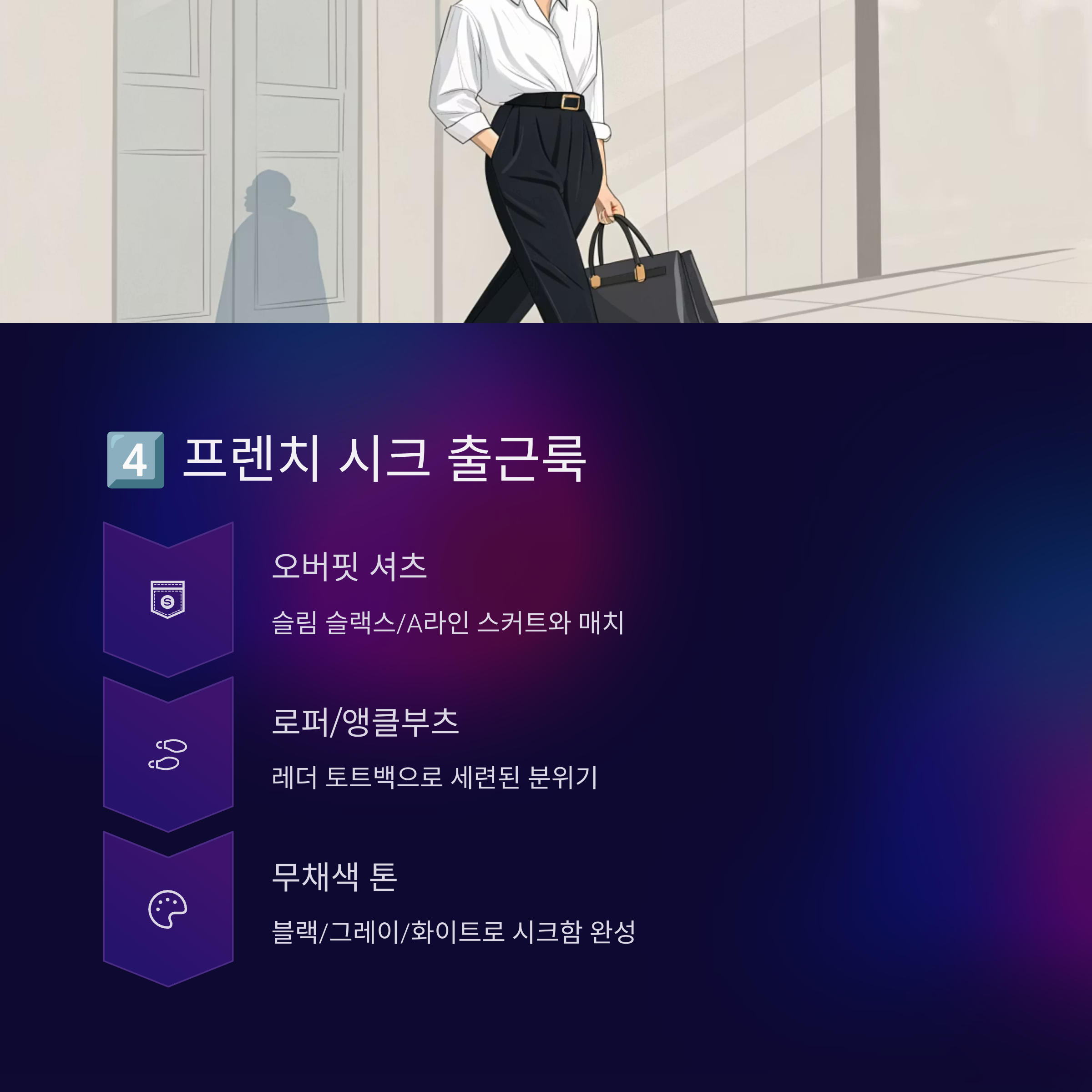 - 코디 팁: 차분한 톤으로 전체 컬러 맞추고, 미니멀 액세서리로 마무리!