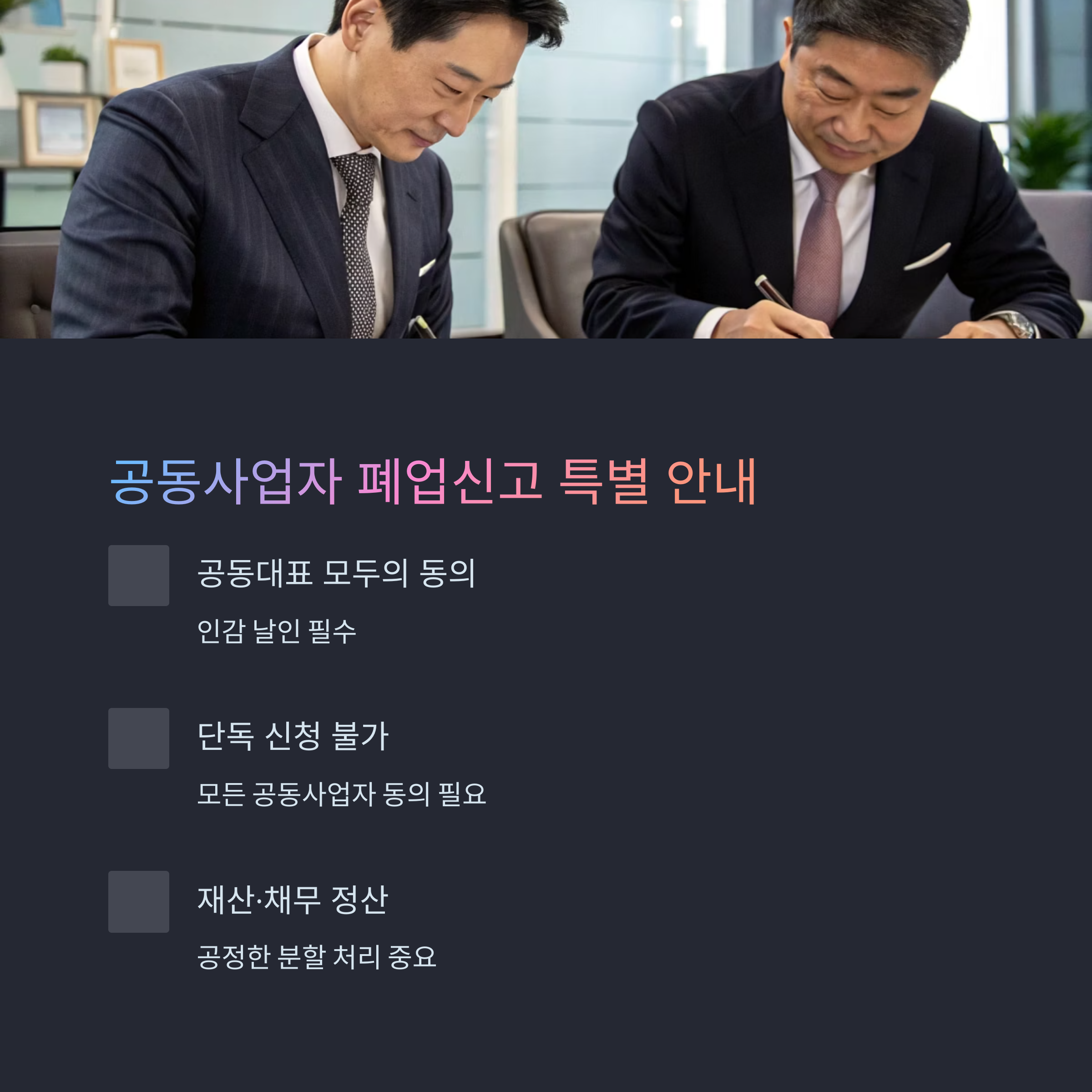 | 공동대표자 모두 신고 | 전체 폐업 인정 → 사업자등록 말소 |