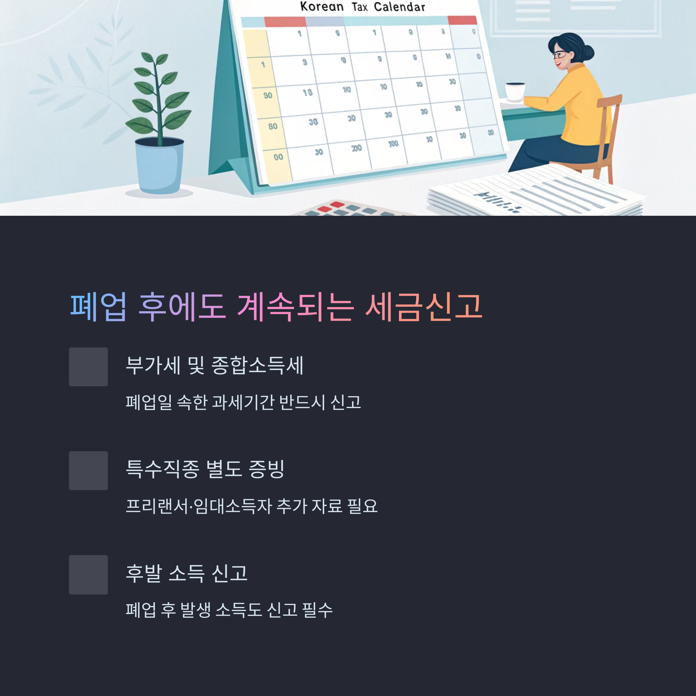 - 폐업 후: 부가세/소득세 정산 반드시 추가로 필요