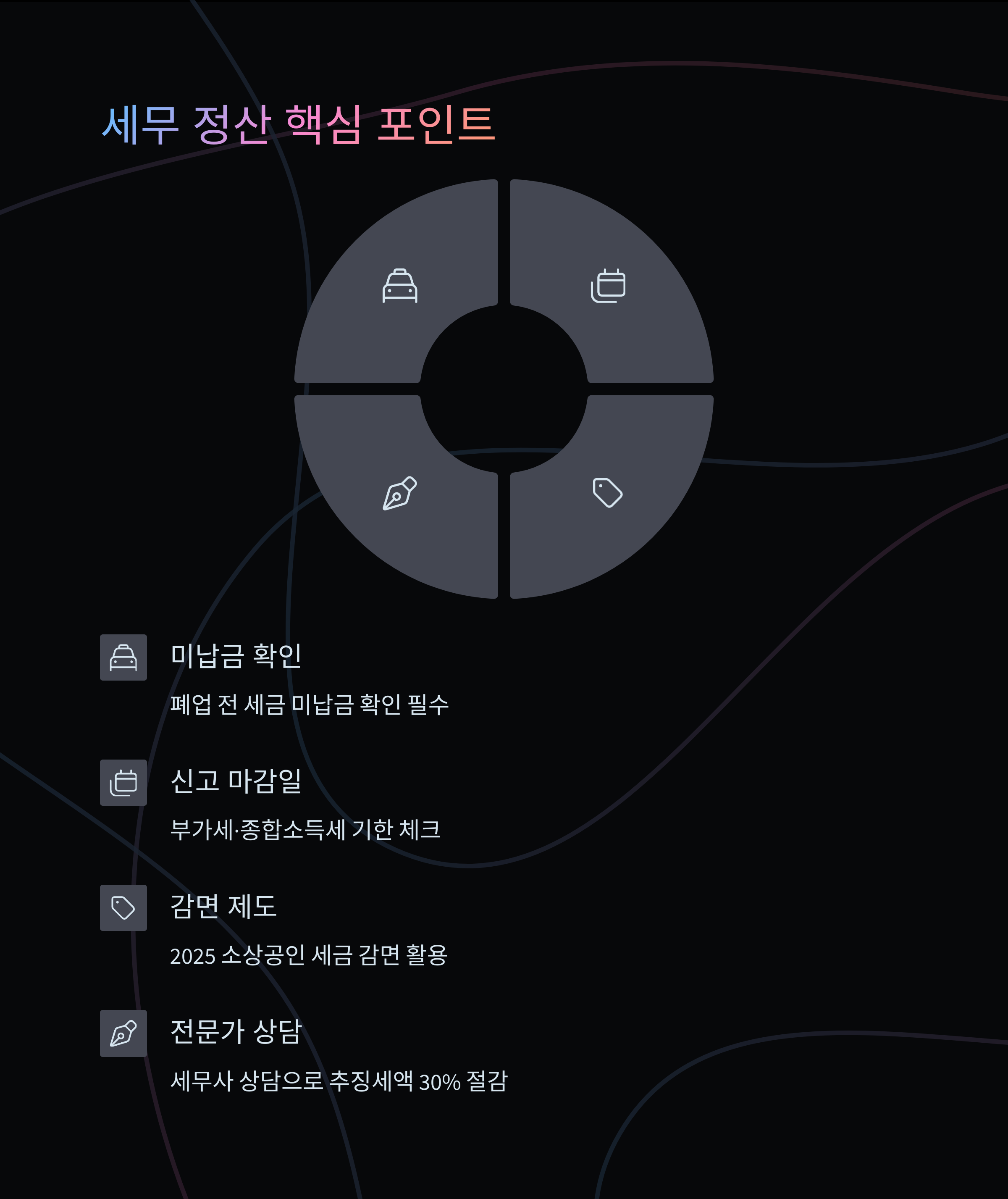 폐업 시에는 세금 정산에서 가산세, 누락, 과세 사유 발생 등 예기치 않은 문제가 발생할 수 있습니다.