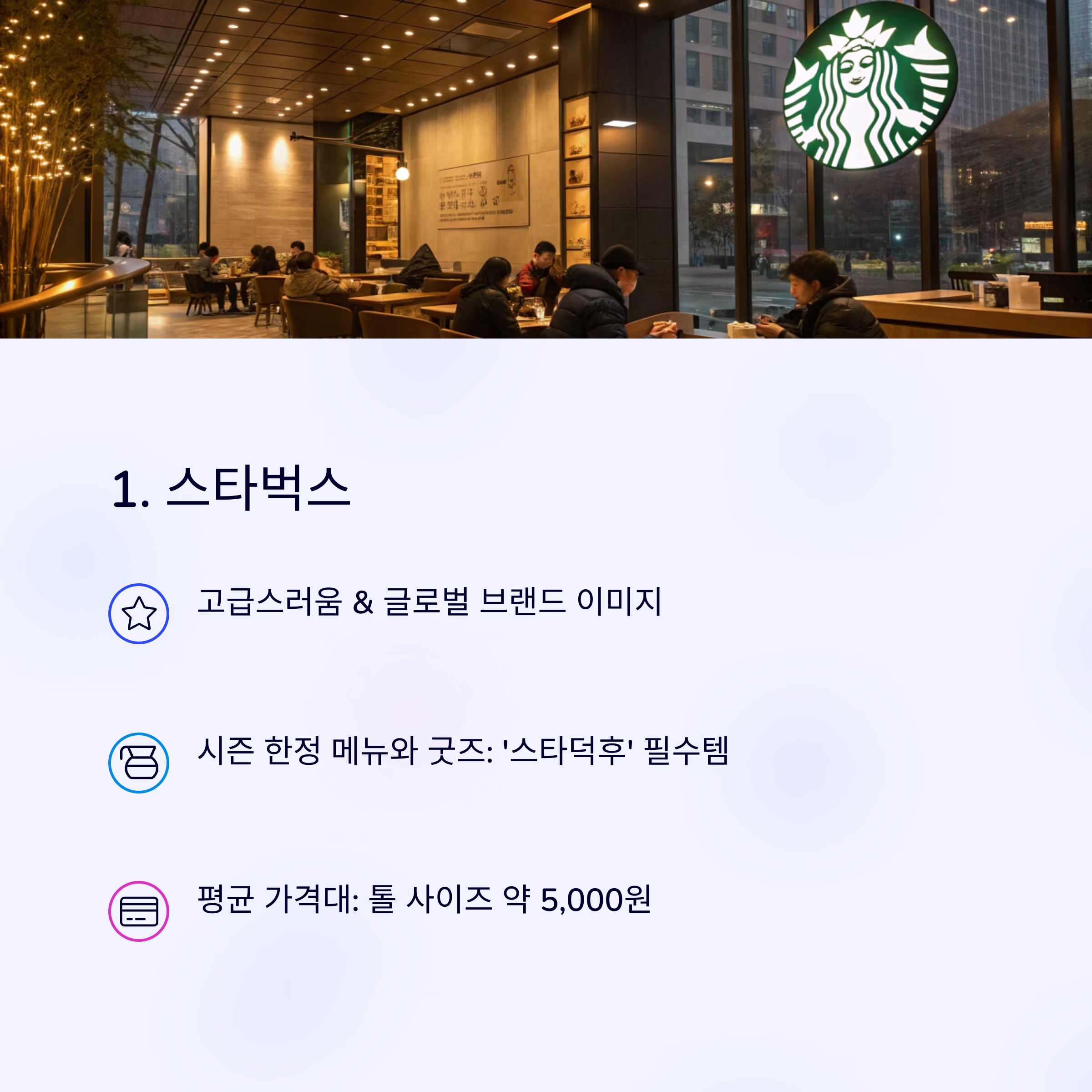 프리미엄 카페의 상징으로 자리 잡은 스타벅스는 전 세계적으로 사랑받는 글로벌 브랜드입니다. 고급스러운 인테리어, 편안한 좌석, 다양한 음료 라인업으로 오랫동안 사랑받아 왔죠. 특히 시즌 한정 음료나 굿즈는 늘 큰 인기를 끌며 '스타벅스 덕후'를 만들어내기도 해요.