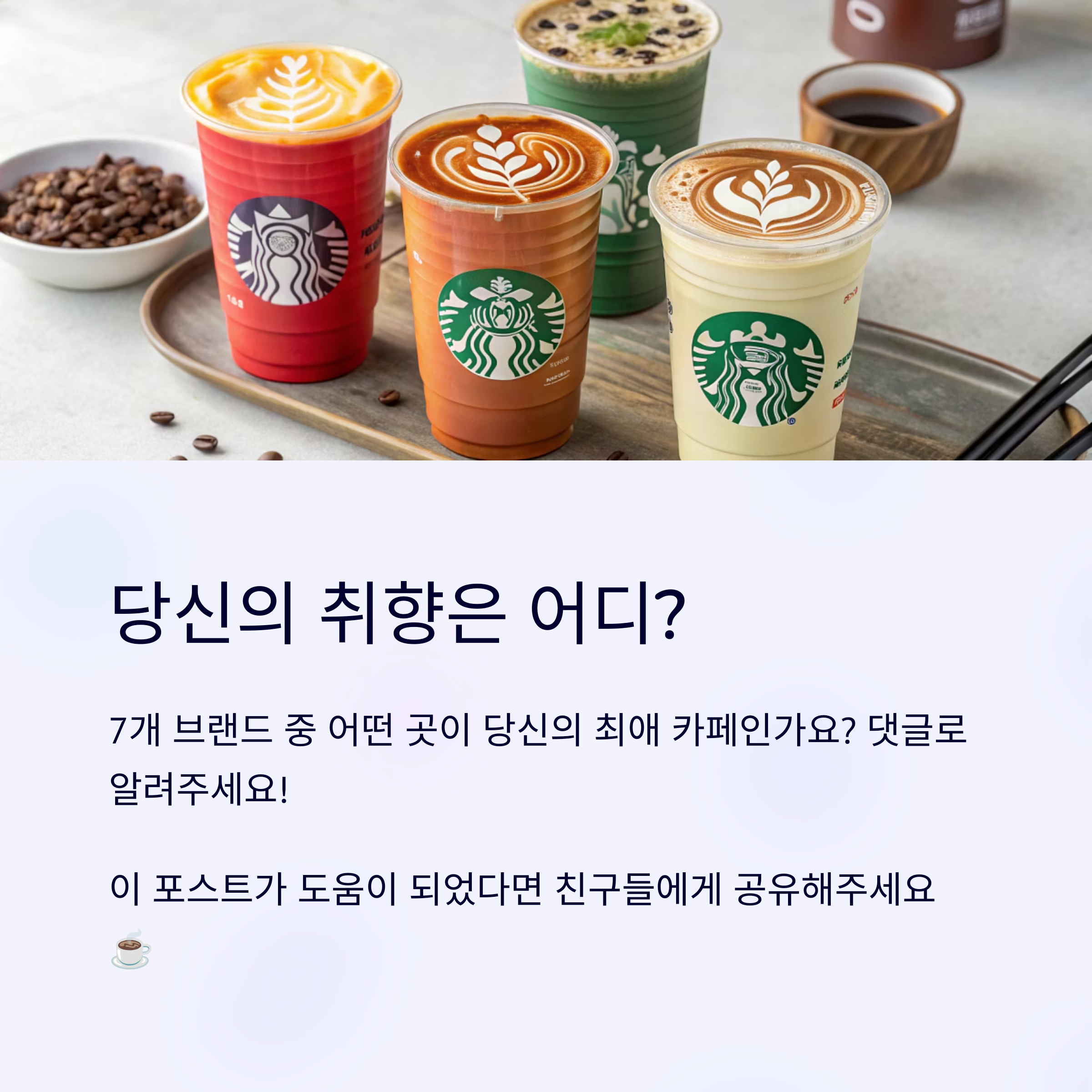 오늘은 스타벅스를 중심으로 유명 커피 프랜차이즈의 첫 번째 이야기를 소개해드렸어요. 브랜드의 분위기, 가격대, 대표 메뉴 등 다양한 요소를 비교하며 여러분의 선택에 도움이 되고자 했습니다. 앞으로도 나머지 브랜드들도 하나씩 소개해드릴 테니 기대해 주세요. 평소 즐겨 찾는 커피 브랜드가 있다면 댓글로 이유도 함께 공유해주세요. 여러분의 소중한 의견이 또 다른 콘텐츠로 이어질 수 있답니다.