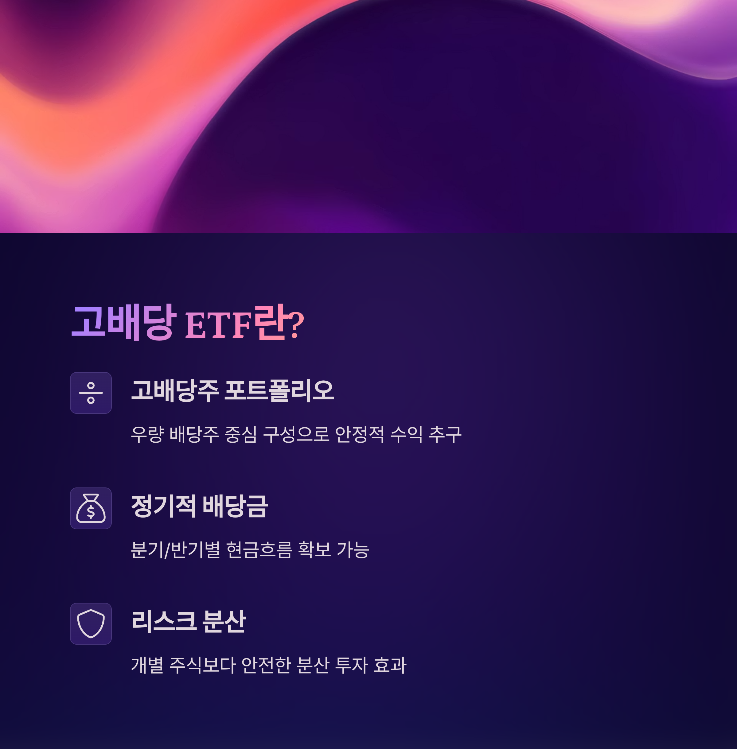 고배당 ETF는 고배당주를 중심으로 구성된 상장지수펀드로, 일정 주기에 따라 분배금 형태로 수익을 돌려주는 구조를 가집니다.