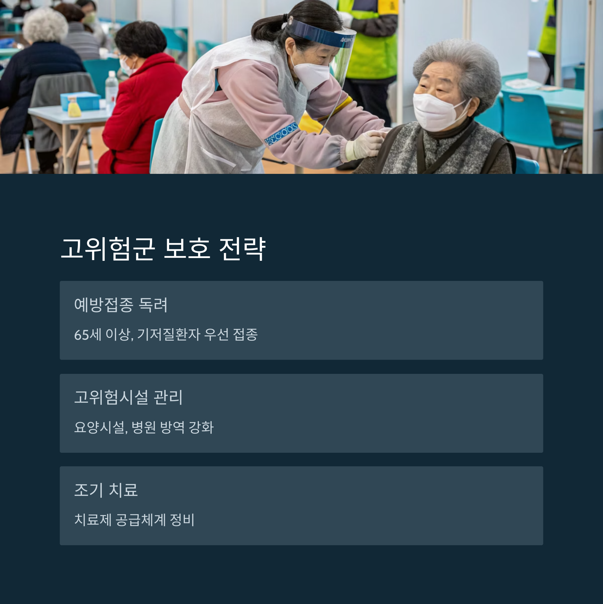 - 고위험군 중심 방역: 병상, 백신, 항바이러스제 준비 상황