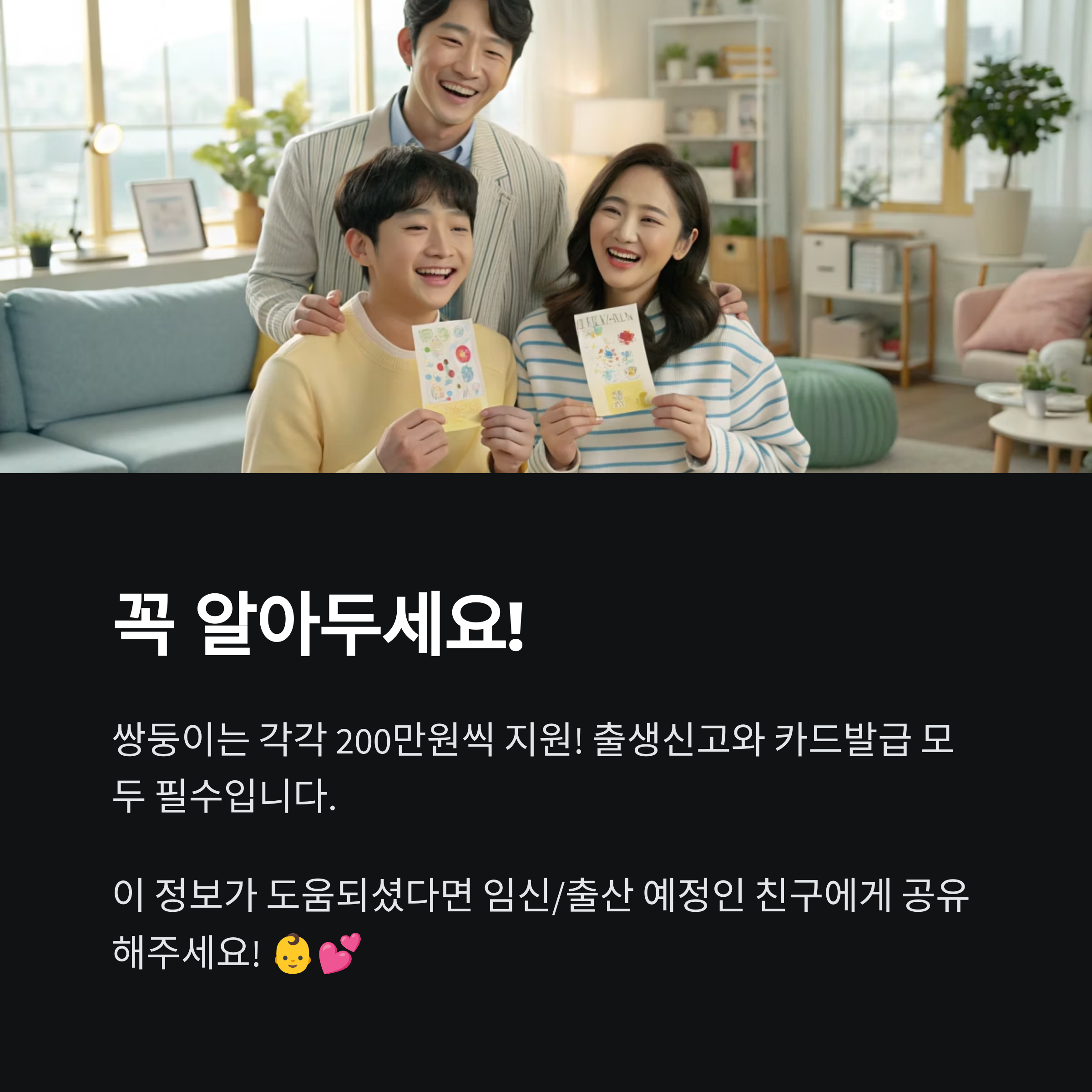 - 쌍둥이 출산 시 각각 200만 원씩 지급