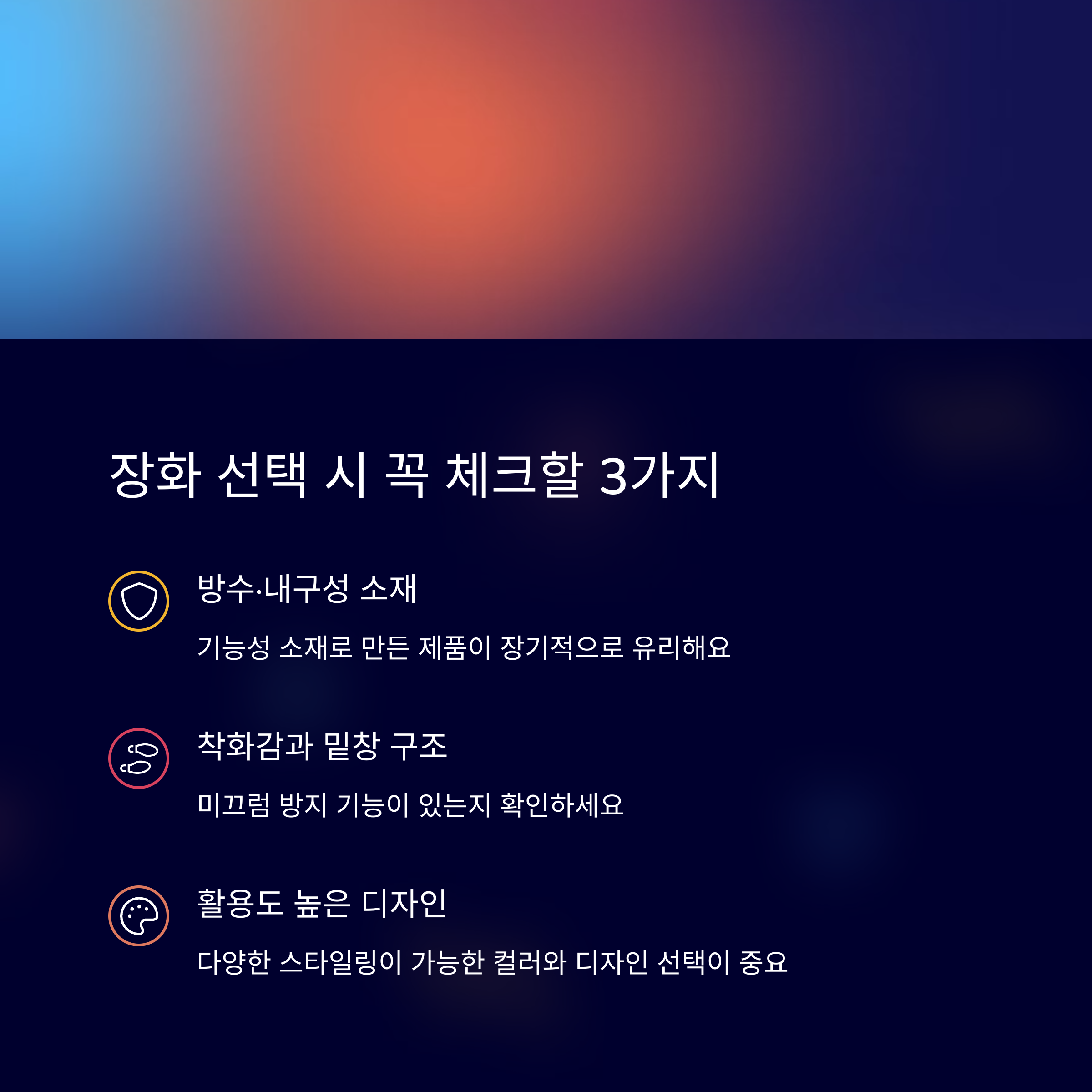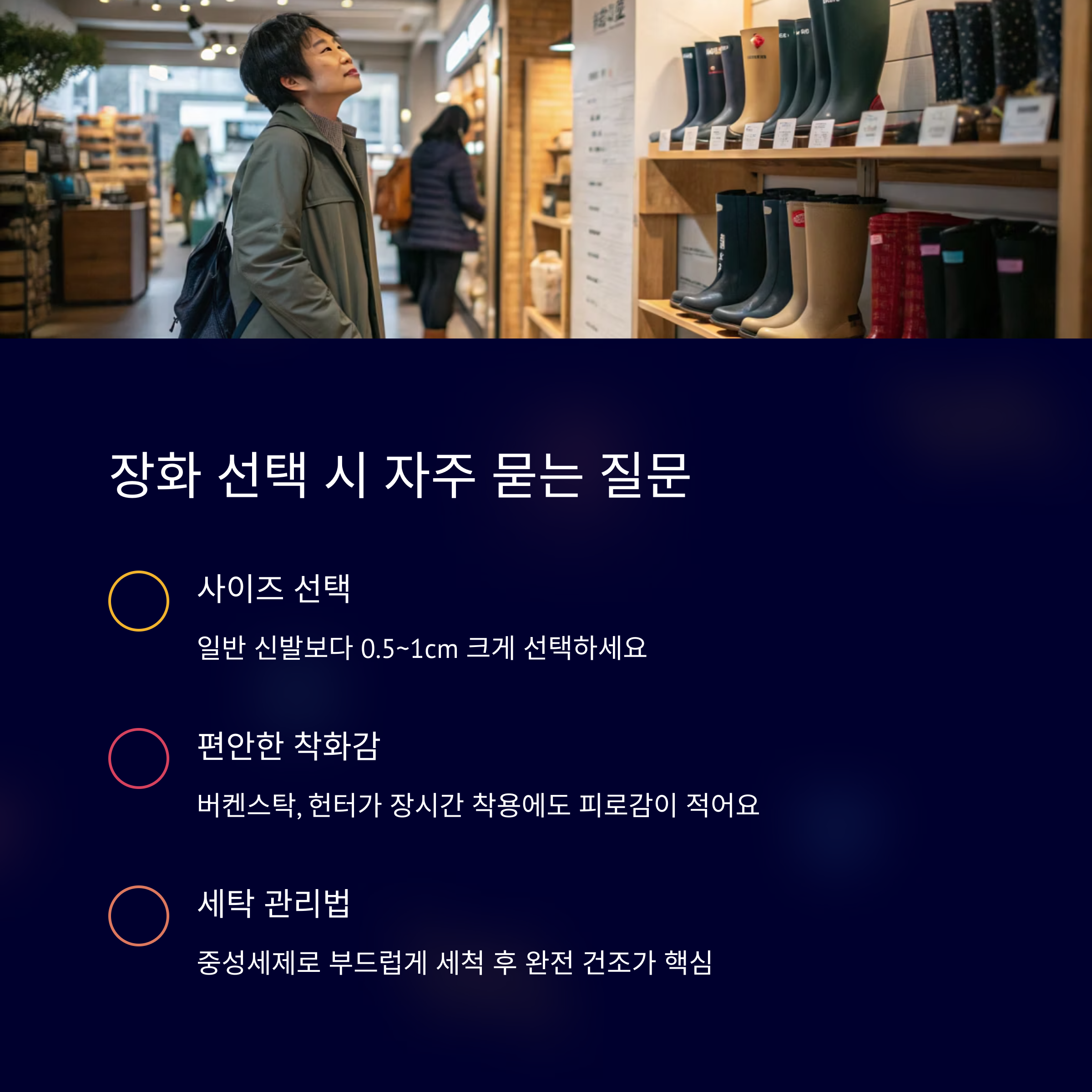 내구성, 방수력, 미끄럼 방지 기능은 장화 선택의 핵심입니다.