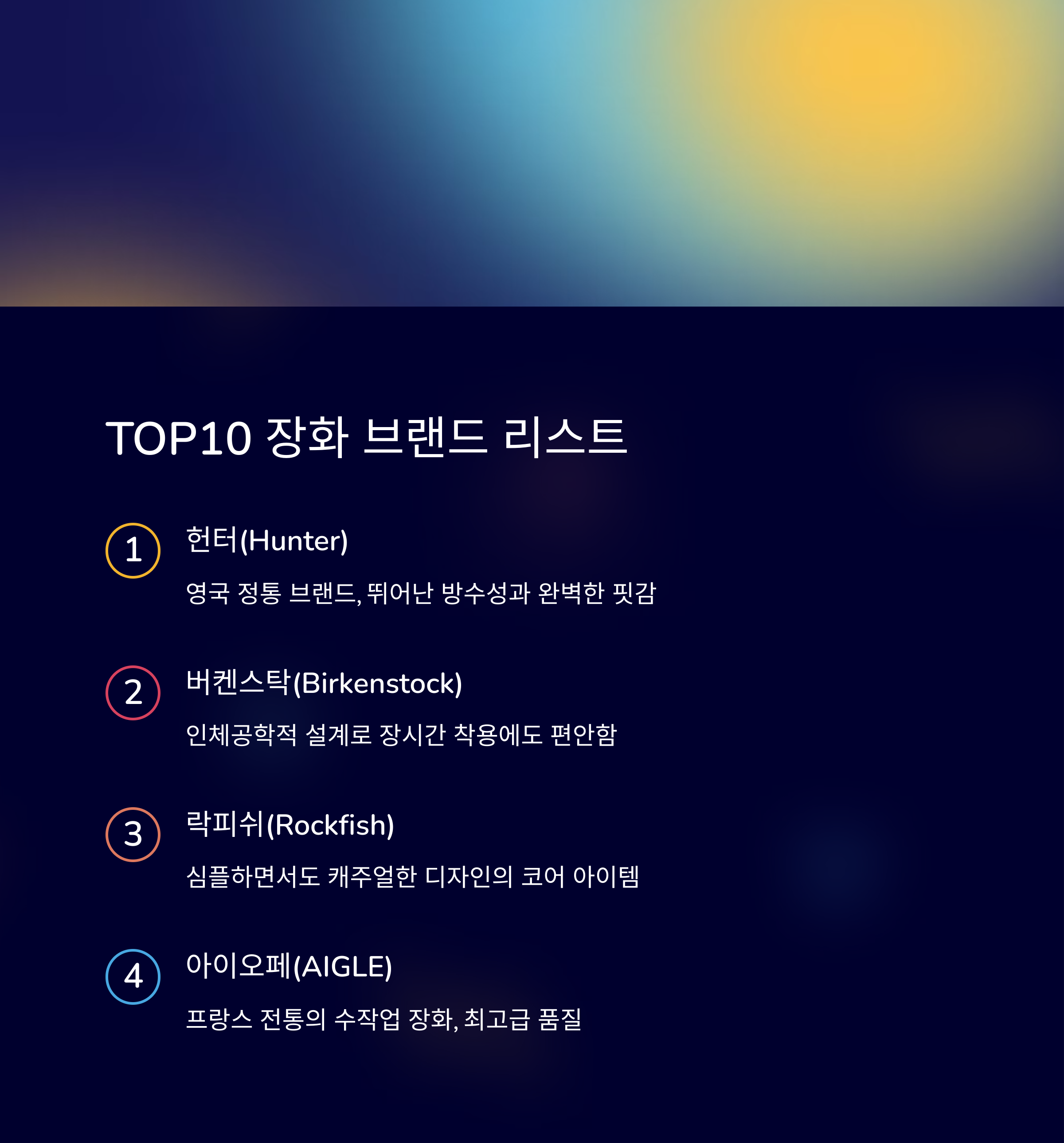 올해는 어떤 장화를 골라야 할까요? 스타일과 기능을 모두 갖춘 장화, 이제는 선택이 아닌 필수가 되었죠. 2025년을 책임질 TOP10 장화 브랜드를 소개합니다.