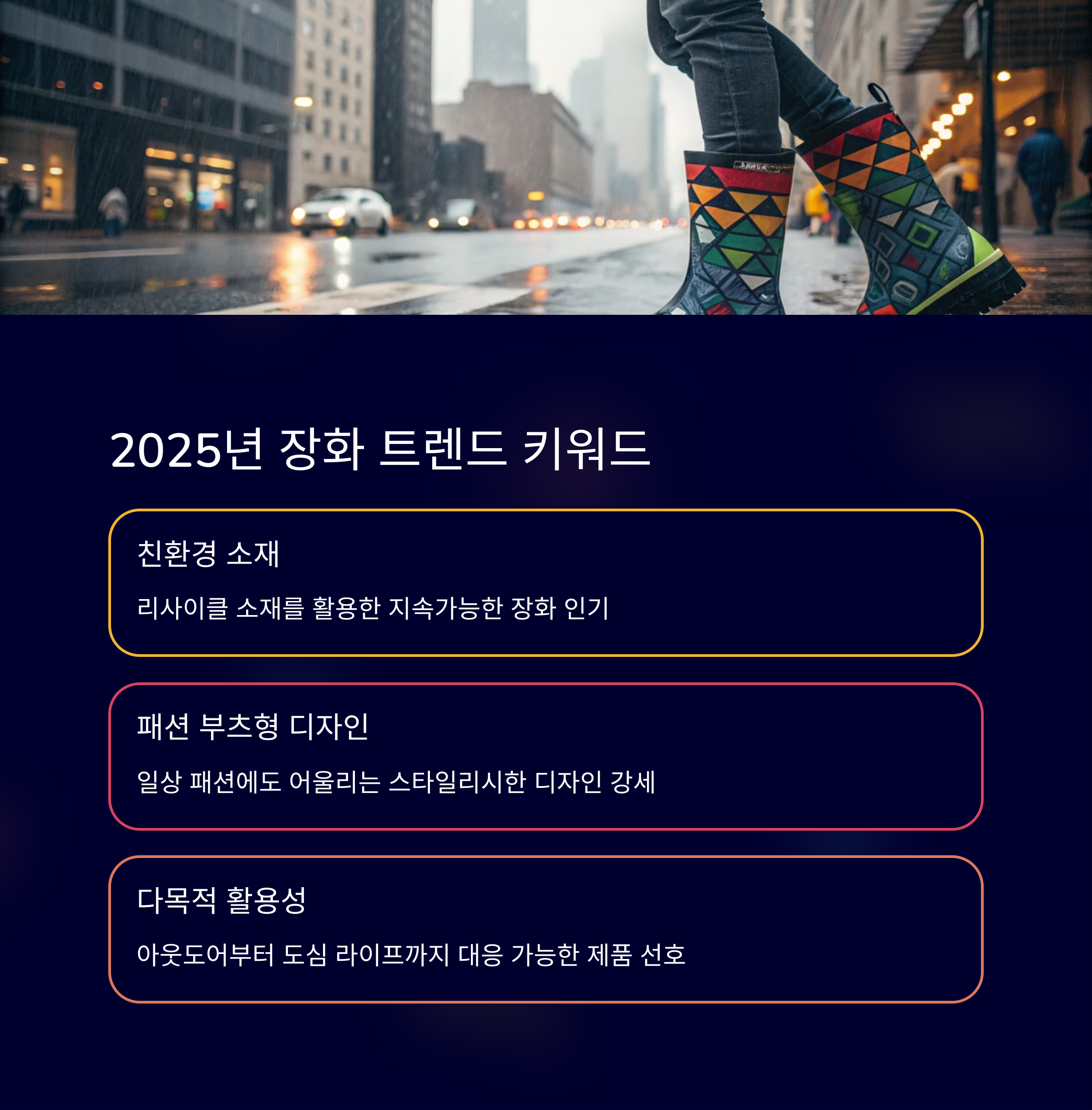 2025년 장화 트렌드는 실용성과 패션을 동시에 잡은 제품에 집중되고 있어요. 일상에서의 활용뿐 아니라 캠핑, 낚시 등 레저 활동까지 커버하는 멀티 아이템이 인기예요. 고무소재보다는 PU 소재와 하이브리드 형태의 소재가 늘어나고 있는 것도 눈에 띄는 특징입니다.