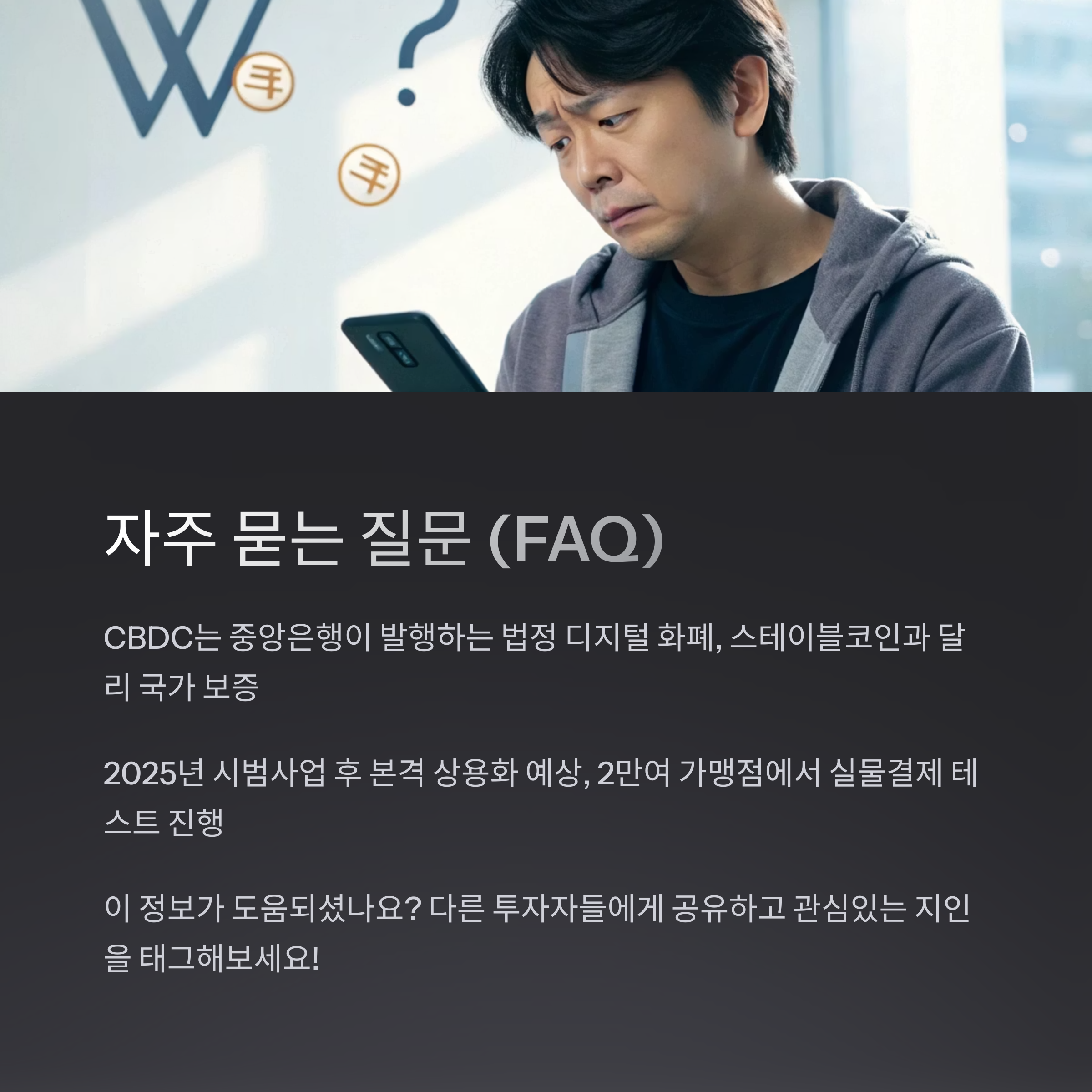 CBDC는 중앙은행이 발행하는 디지털 화폐로, 실물 화폐의 대안이자 미래 결제 인프라의 핵심입니다. 한국은행은 2025년 하반기부터 유통망 시범사업을 본격 추진할 예정입니다.
