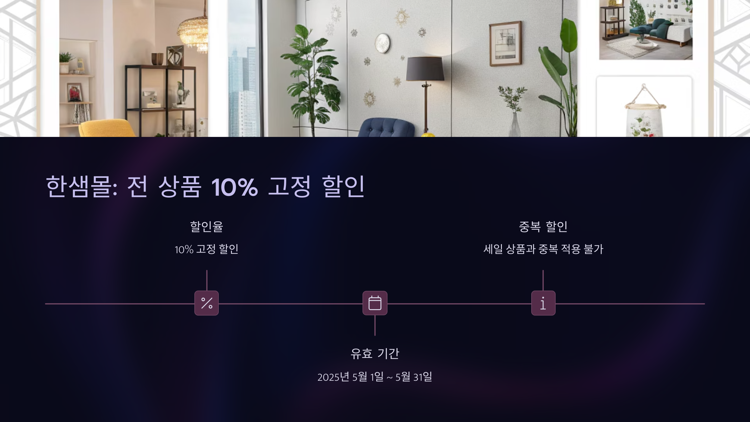 - 한샘몰: 전 상품 10% 고정 할인