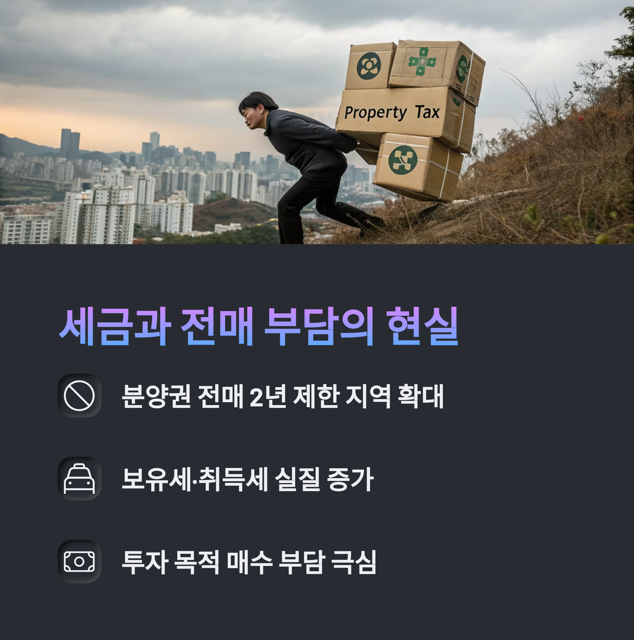 거래는 전매·보유세·취득세 부담까지 동시에 가중됩니다.