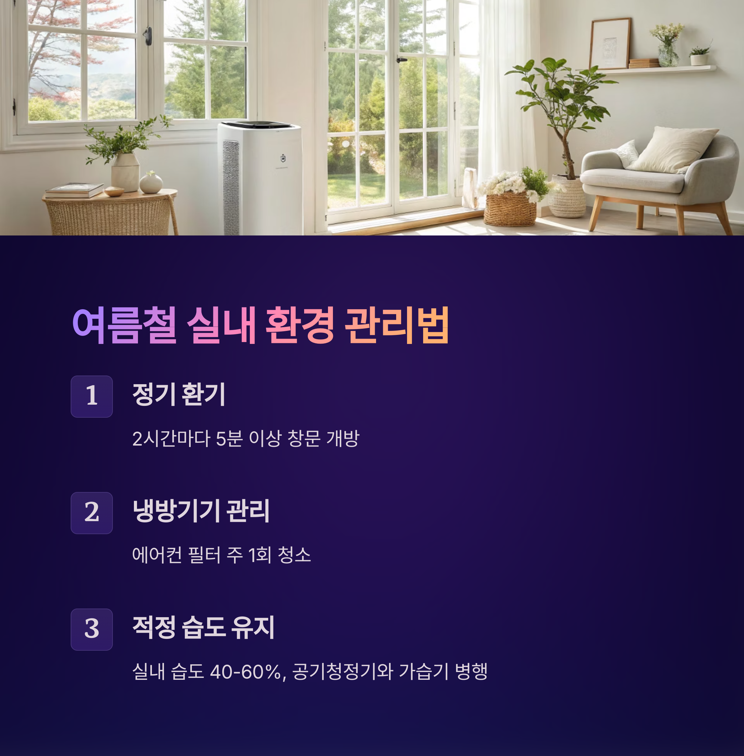 | 환기 생활화 | 냉방 중에도 2시간마다 창문 열어 환기 5분 이상 실시 |