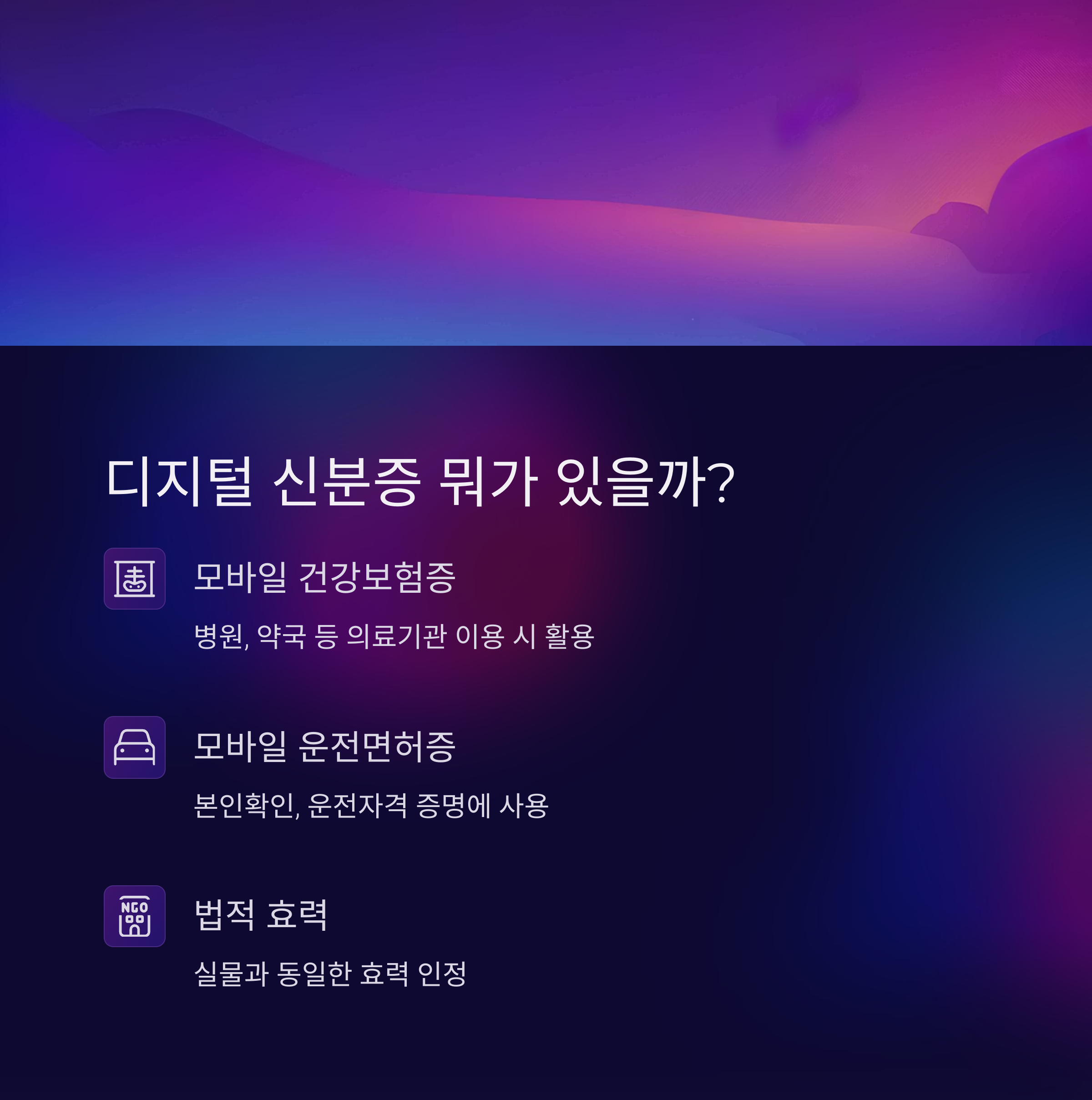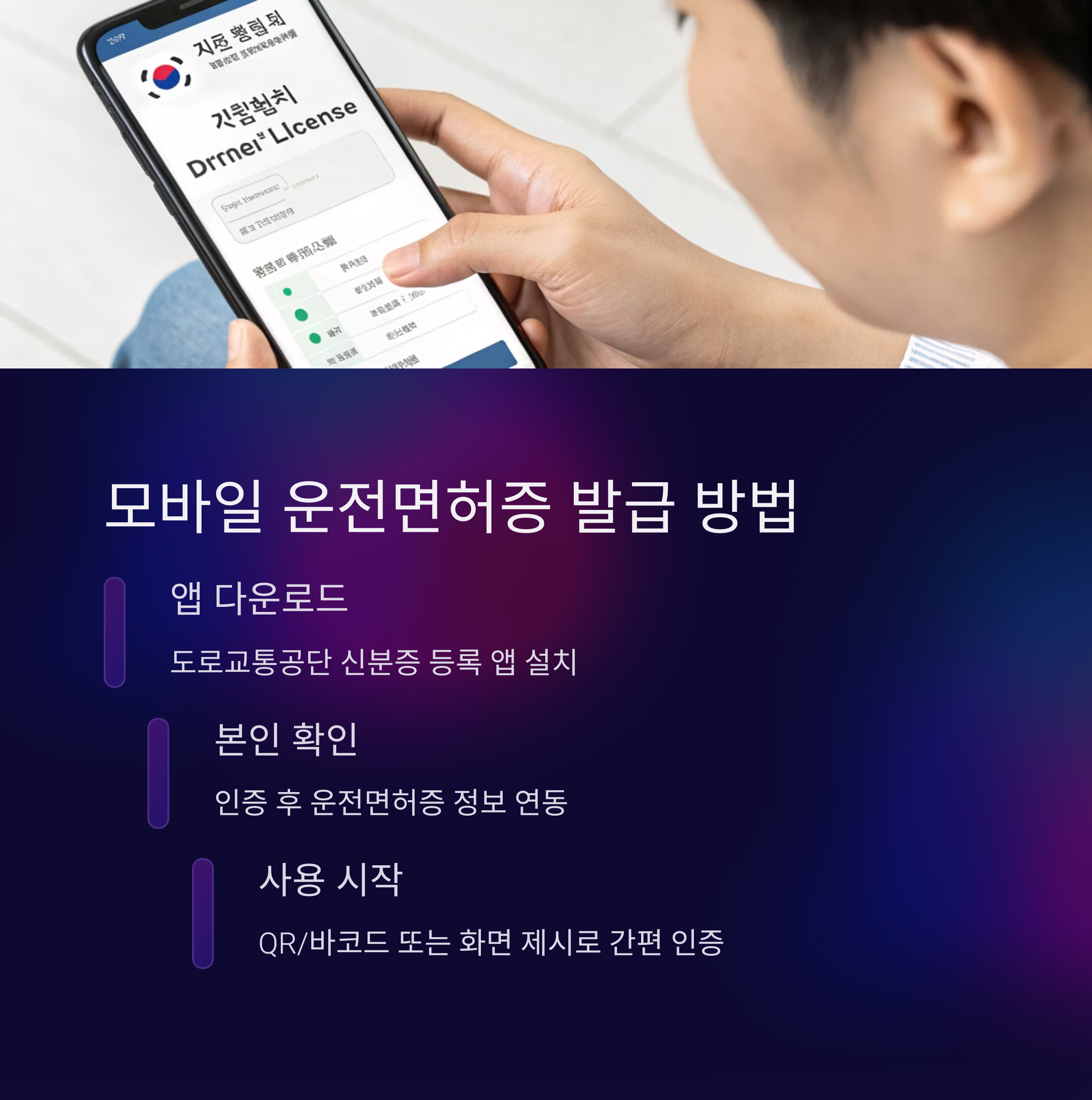 | 모바일 운전면허증 | 도로교통공단·행안부가 발급하는 디지털 운전 자격증. 교통단속, 금융기관, 렌터카에서 공식 인증 수단 |