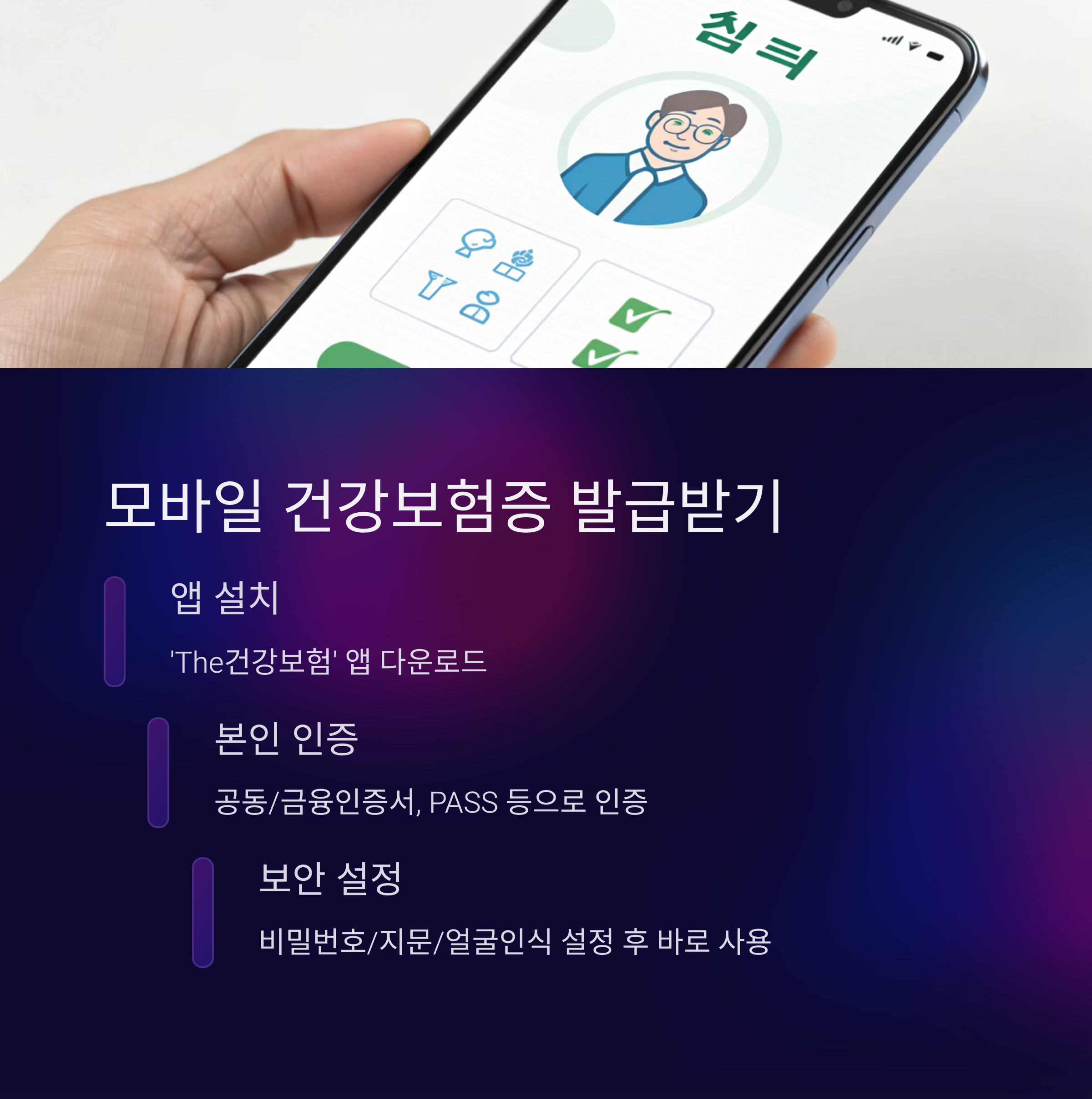 | The건강보험 앱 | O | 앱 실행 → 로그인 → 모바일 건강보험증 메뉴 → 본인 인증 → 발급 완료 |