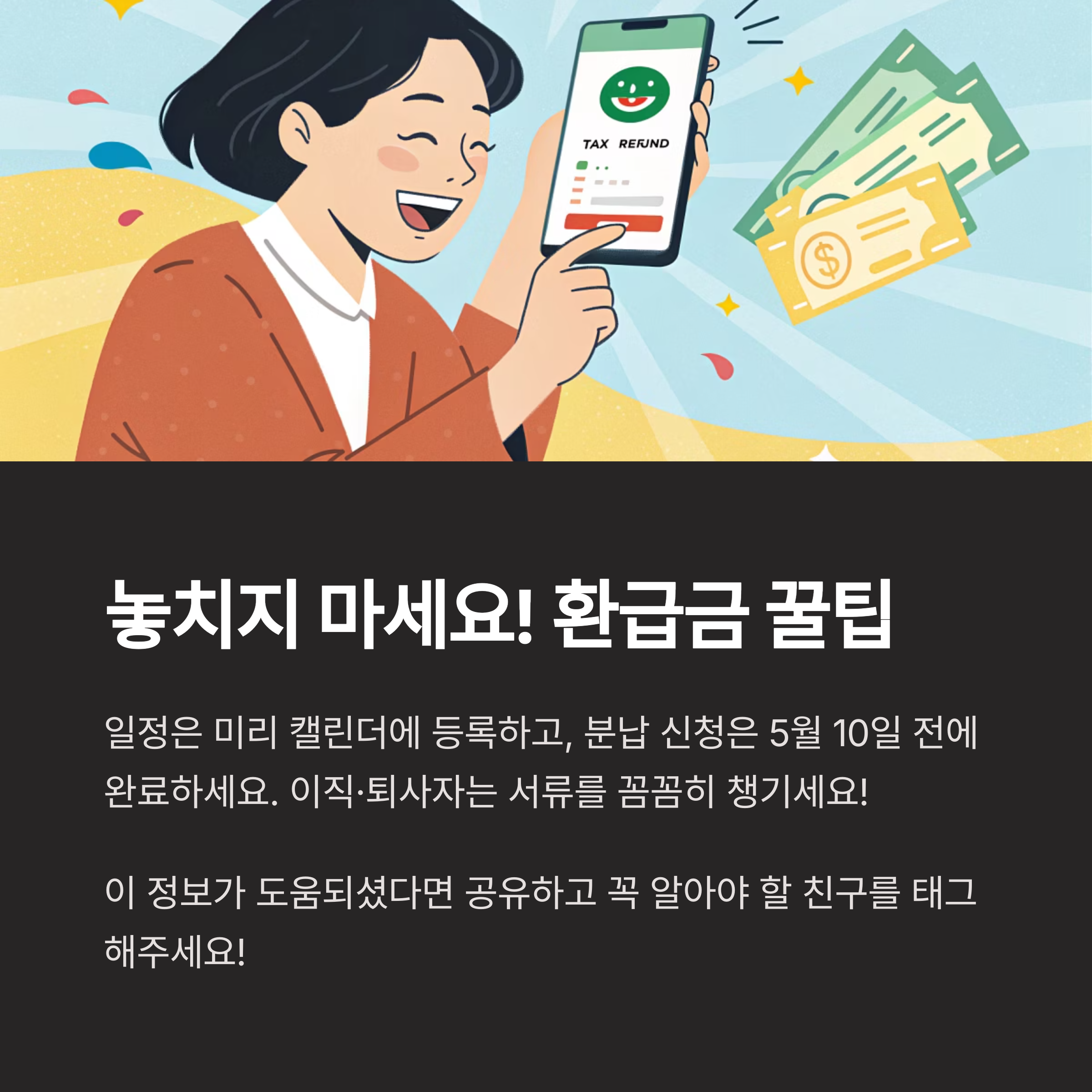 정해진 기간 내에 정확히 확인하고 준비하여 누락되는 환급금 없이 꼼꼼히 마무리하시기 바랍니다.