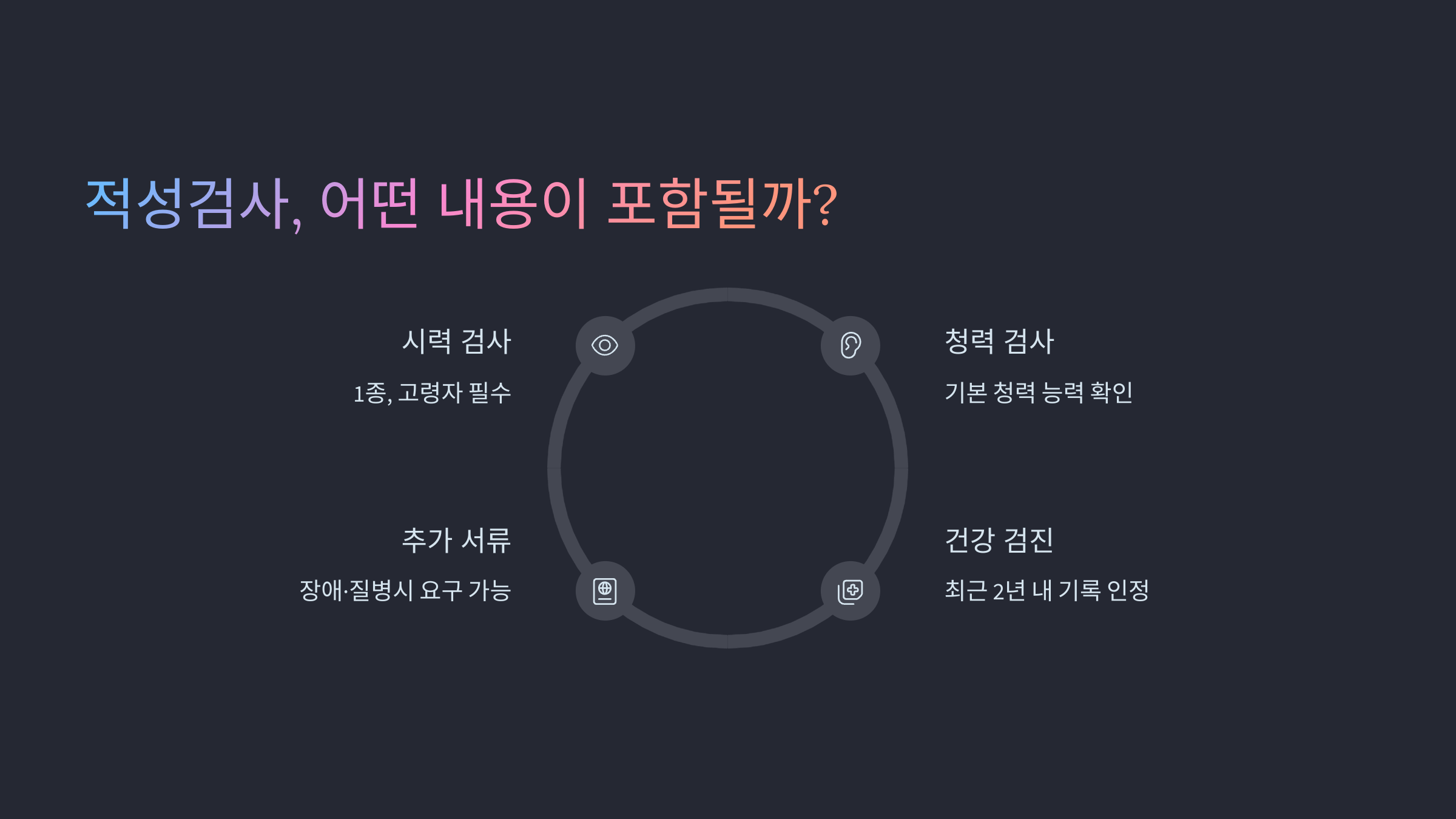 - 시력 검사: 양안 시력 0.7 이상 (교정 가능)