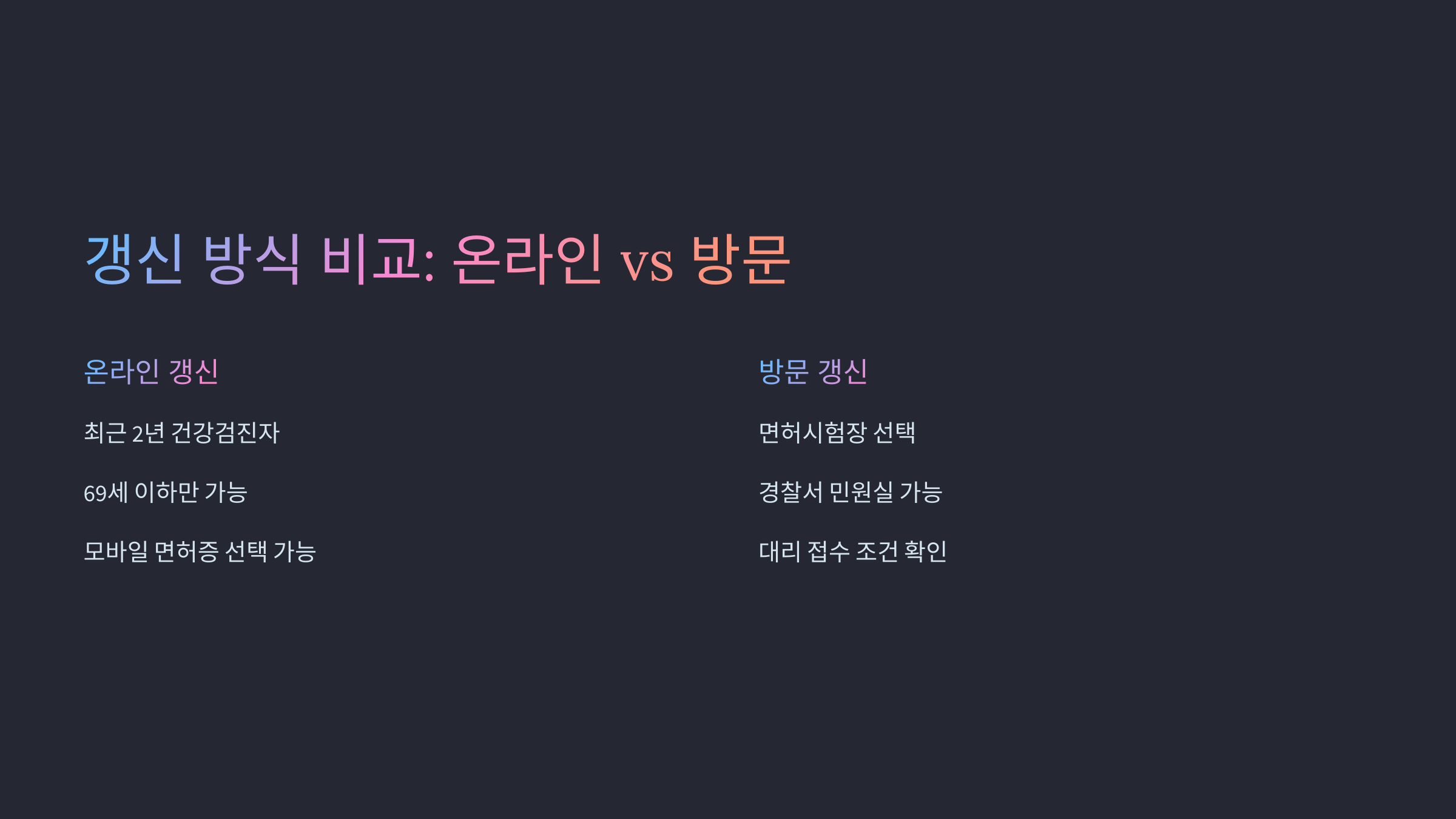| 추천 대상자 | 1종 면허 소지자, 고령자 | 단순 2종 갱신, 사진 지참자 |