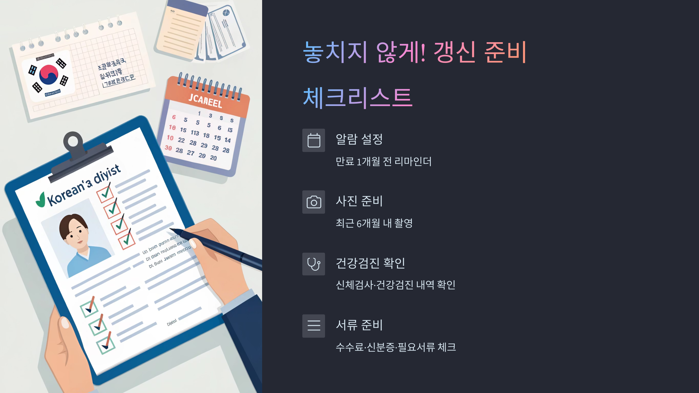 - 준비물 체크: 신분증, 사진, 건강검진서 등