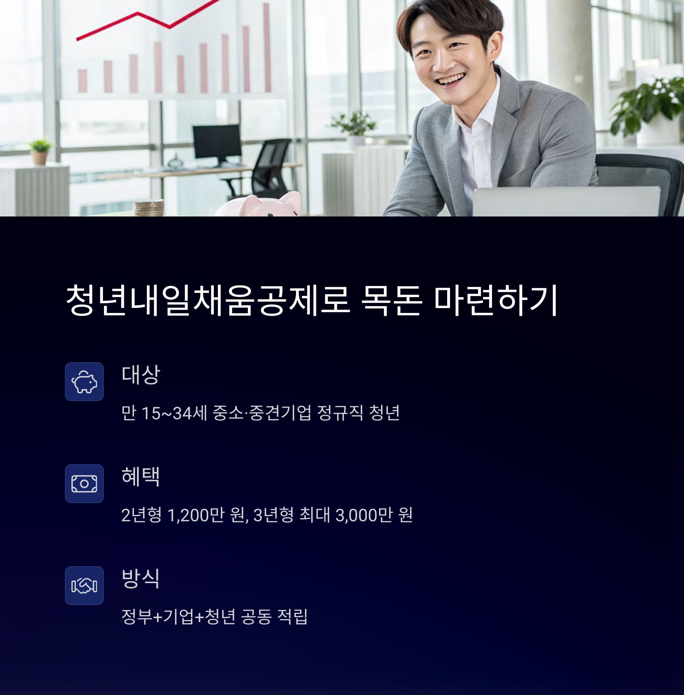 - 청년이 2년간 300만 원 납입하면, 정부+기업이 나머지 900만 원 지원